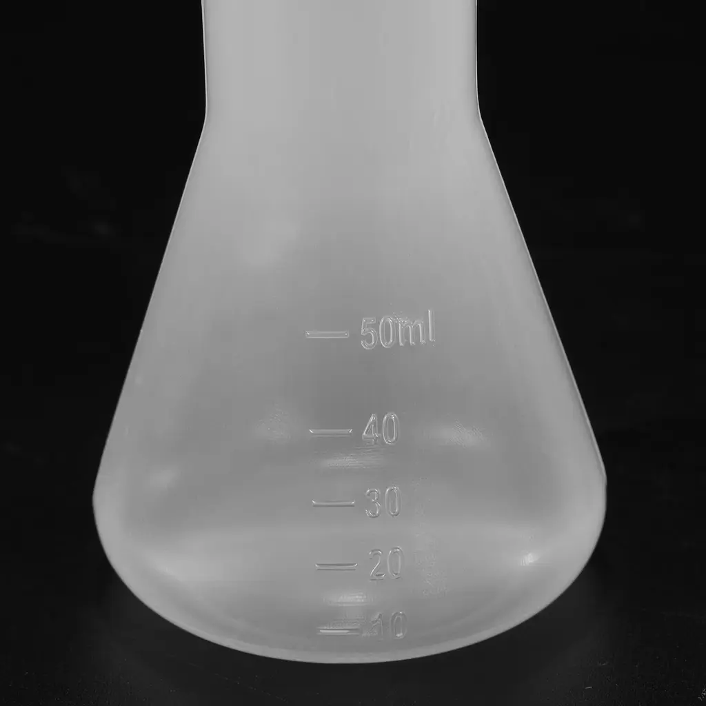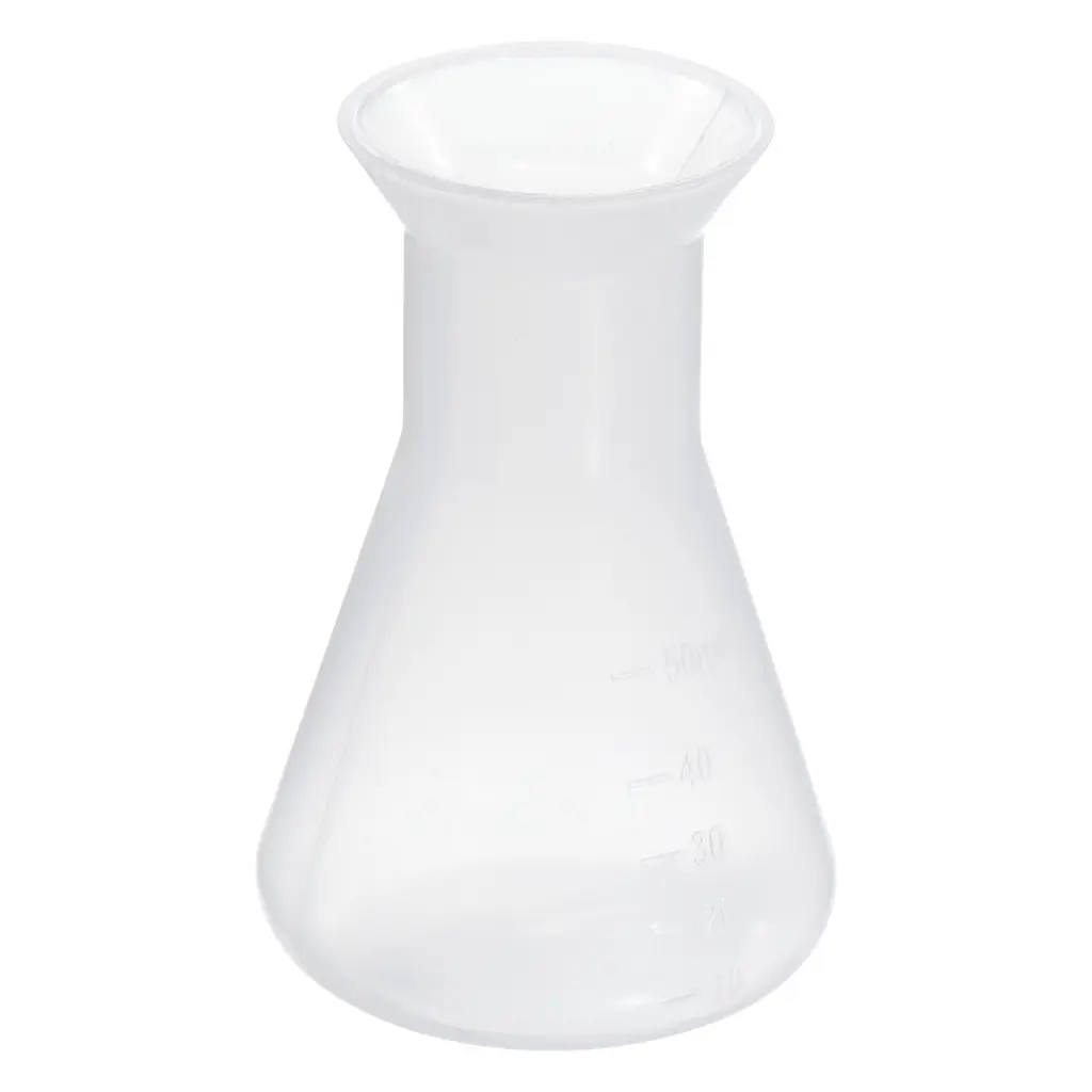 Our Erlenmeyer flasks are essential tools for various lab settings and experiments. They are perfect for measuring and storing liquids or chemicals, as well as for performing reaction processes such as titration. Their unique shape and design make them suitable for mixing and swirling substances.SpecificationMaterial: PlasticColor: ClearCapacity:50mlTotal Size: 5.1 x 8.1cm / 2.01 x 3.19 inch (D*H)Mouth Dia.: 3.8cm / 1.5 inchPackage List: 1 x Plastic Erlenmeyer FlaskAdvantageMade from plastic material that is durable, lightweight, and easy to handle. The flasks feature clear graduations for accurate volume measurement. InstructionThe Erlenmeyer flasks have a conical shape that provides excellent mixing and swirling capabilities. They have a wide base design that offers added stability and ease of handling. The clear graduations on the side make it easy to measure accurate volumes of liquids or chemicals.NoticeAlways avoid exposing them to extreme temperatures or harsh chemicals that may cause deformation or discoloration. Clean them thoroughly after each use and store them properly in a safe place.