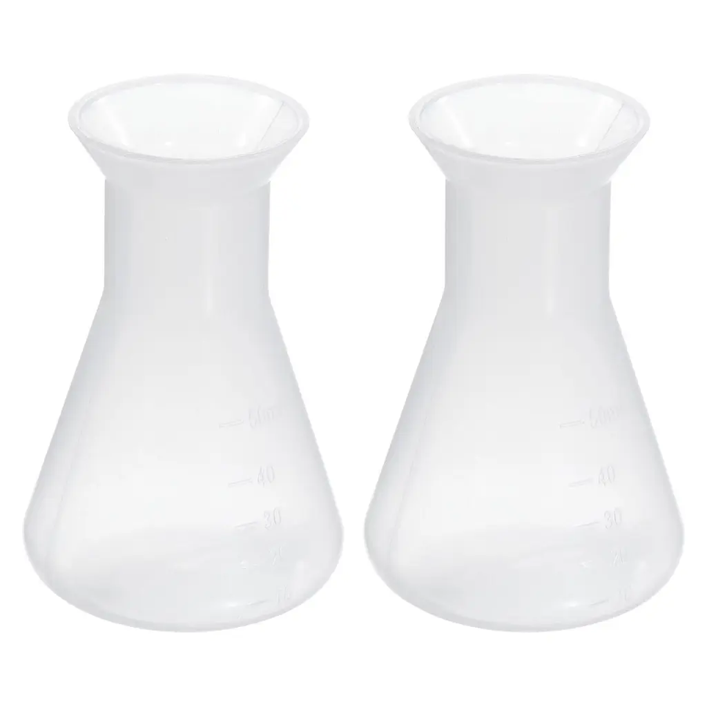 Our Erlenmeyer flasks are essential tools for various lab settings and experiments. They are perfect for measuring and storing liquids or chemicals, as well as for performing reaction processes such as titration. Their unique shape and design make them suitable for mixing and swirling substances.SpecificationMaterial: PlasticColor: ClearCapacity:50mlTotal Size: 5.1 x 8.1cm / 2.01 x 3.19 inch (D*H)Mouth Dia.: 3.8cm / 1.5 inchPackage List: 2 x Plastic Erlenmeyer FlaskAdvantageMade from plastic material that is durable, lightweight, and easy to handle. The flasks feature clear graduations for accurate volume measurement. InstructionThe Erlenmeyer flasks have a conical shape that provides excellent mixing and swirling capabilities. They have a wide base design that offers added stability and ease of handling. The clear graduations on the side make it easy to measure accurate volumes of liquids or chemicals.NoticeAlways avoid exposing them to extreme temperatures or harsh chemicals that may cause deformation or discoloration. Clean them thoroughly after each use and store them properly in a safe place.