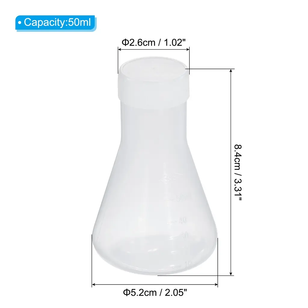 Our Erlenmeyer flasks are essential tools for various lab settings and experiments. They are perfect for measuring and storing liquids or chemicals, as well as for performing reaction processes such as titration. Their unique shape and design make them suitable for mixing and swirling substances.SpecificationMaterial: PlasticColor: ClearCapacity:50mlTotal Size: 5.2 x 8.4cm / 2.05 x 3.31 inch (D*H)Mouth Dia.: 2.6cm / 1.02 inchPackage List: 1 x Plastic Erlenmeyer FlaskAdvantageMade from plastic material that is durable, lightweight, and easy to handle. The flasks feature clear graduations for accurate volume measurement. InstructionThe Erlenmeyer flasks have a conical shape that provides excellent mixing and swirling capabilities. They have a wide base design that offers added stability and ease of handling. The clear graduations on the side make it easy to measure accurate volumes of liquids or chemicals.NoticeAlways avoid exposing them to extreme temperatures or harsh chemicals that may cause deformation or discoloration. Clean them thoroughly after each use and store them properly in a safe place.