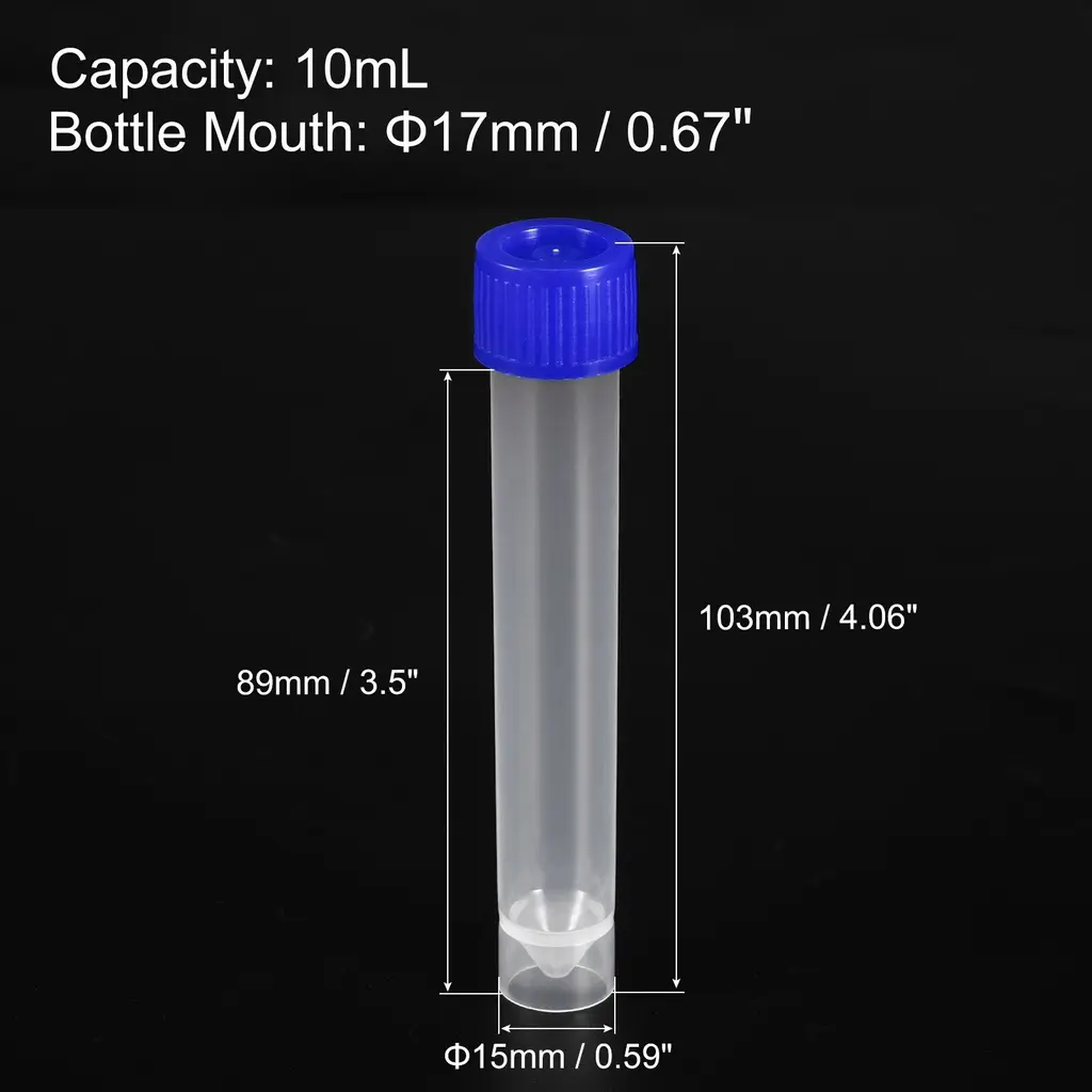 The plastic test tube is mainly used in laboratories to store samples at low temperatures, to prevent sample volatilization. Plastic test tubes with caps can be used to store powders, liquids, and semi-liquids such as aqueous samples and other reagents. SpecificationCap Color: RedBottle Color: TransparentMaterial: PlasticCapacity: 10mLOuter Diameter of Bottle Mouth: 17mm / 0.67 inchBottle Height: 89mm / 3.5 inchOverall Size: 103 x 15mm / 4.06 x 0.59 inch (H*OD)Packing List: 20 x Test Tubes with LidsAdvantageScrew-in and cover pad design seals well and prevents liquid spillage. Test lab tubes are transparent and you can see the remaining amount. Storage tubes, made of durable plastic, are easier to store than glass. Plastic tubes with caps is reusable, low-temperature resistant, and can be frozen for a long time.InstructionUnscrew the cap, pour the liquid into the test bottle, close the cap, and store small test tubes properly.NOTE: Please check the size carefully of these storage tubes with caps before purchasing.