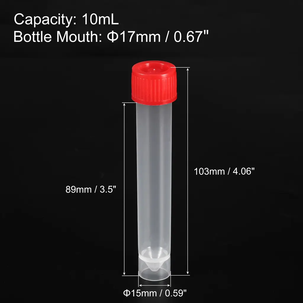 The plastic test tube is mainly used in laboratories to store samples at low temperatures, to prevent sample volatilization. Plastic test tubes with caps can be used to store powders, liquids, and semi-liquids such as aqueous samples and other reagents. SpecificationCap Color: RedBottle Color: TransparentMaterial: PlasticCapacity: 10mLOuter Diameter of Bottle Mouth: 17mm / 0.67 inchBottle Height: 89mm / 3.5 inchOverall Size: 103 x 15mm / 4.06 x 0.59 inch (H*OD)Packing List: 40 x Test Tubes with LidsAdvantageScrew-in and cover pad design seals well and prevents liquid spillage. Test lab tubes are transparent and you can see the remaining amount. Storage tubes, made of durable plastic, are easier to store than glass. Plastic tubes with caps is reusable, low-temperature resistant, and can be frozen for a long time.InstructionUnscrew the cap, pour the liquid into the test bottle, close the cap, and store small test tubes properly.NOTE: Please check the size carefully of these storage tubes with caps before purchasing.