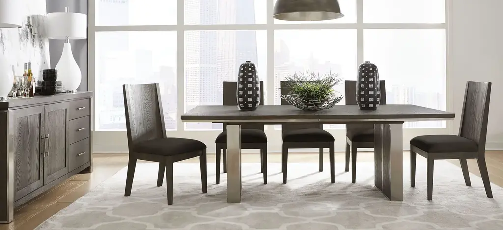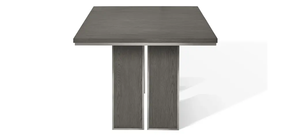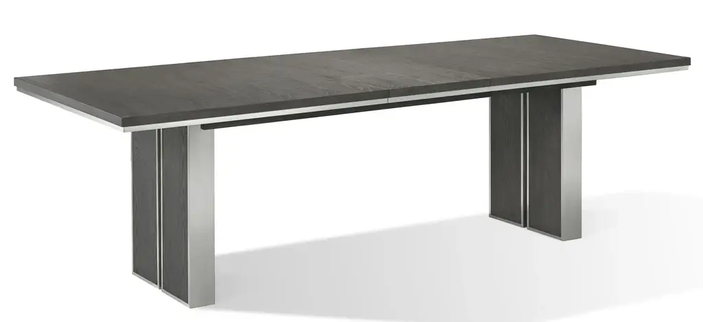 With stately proportions and a crisp silhouette, the Plata Dining Table w/ Leaf combines natural and manmade elements for a striking composition. Veneers are wire brushed to simulate the patina of naturally weathered wood then accented with brushed stainless steel for the perfect finish.