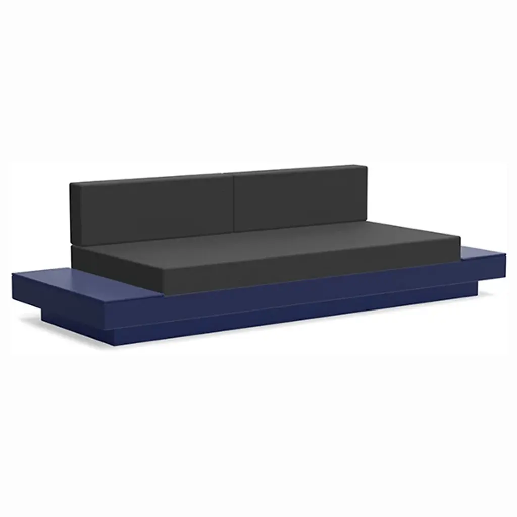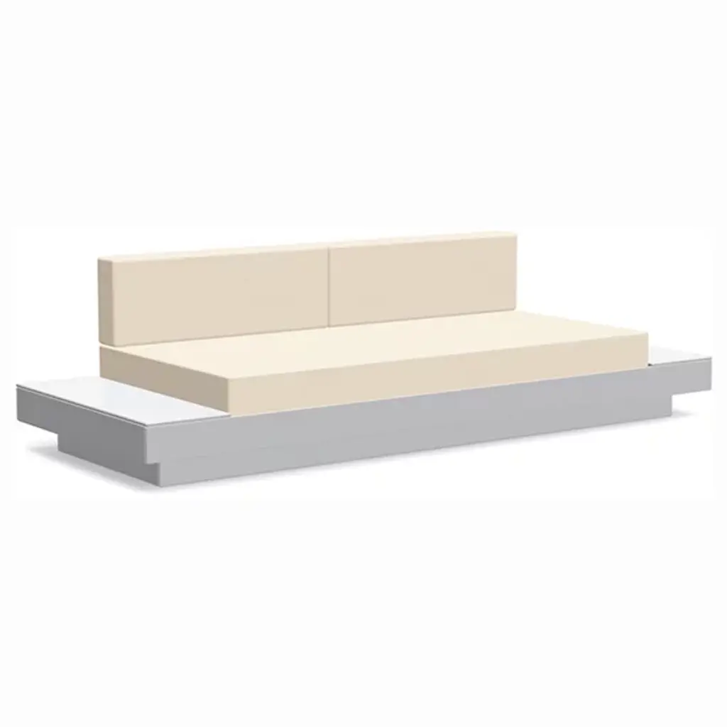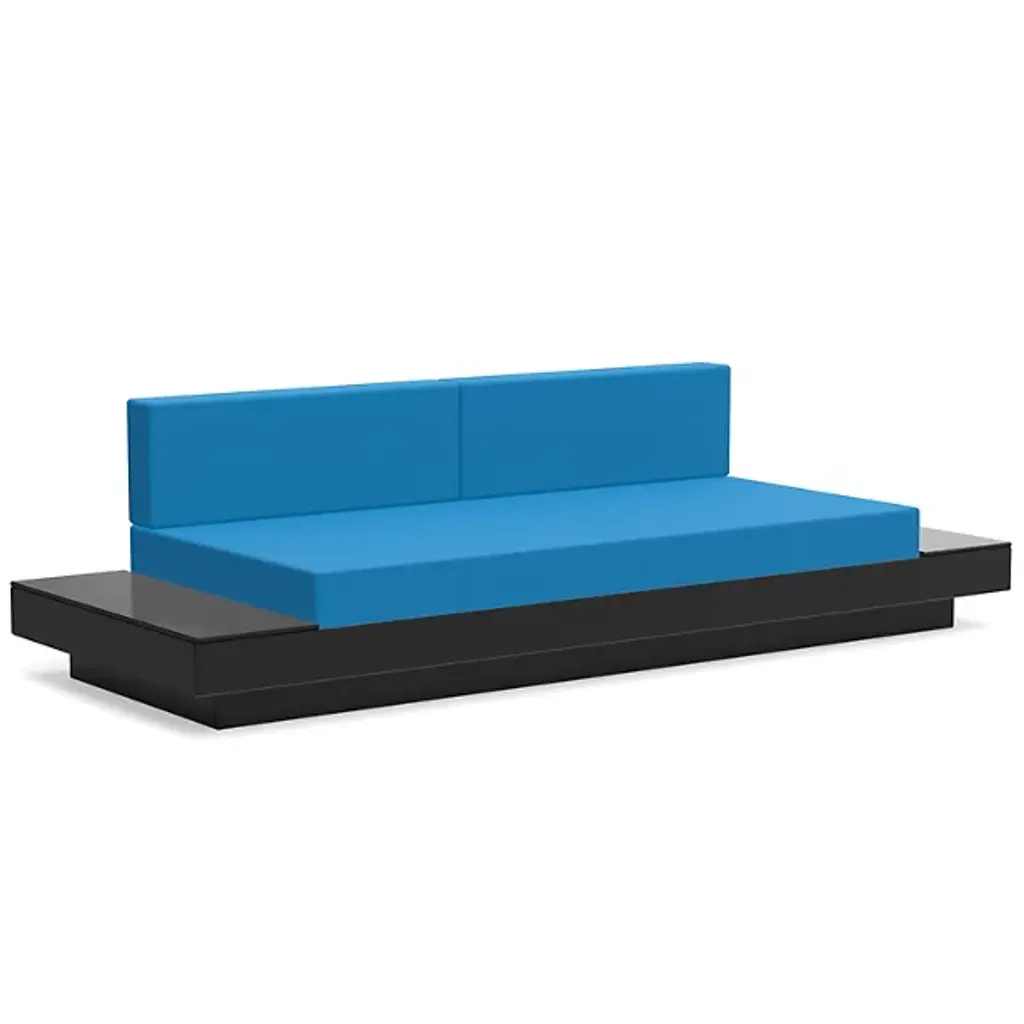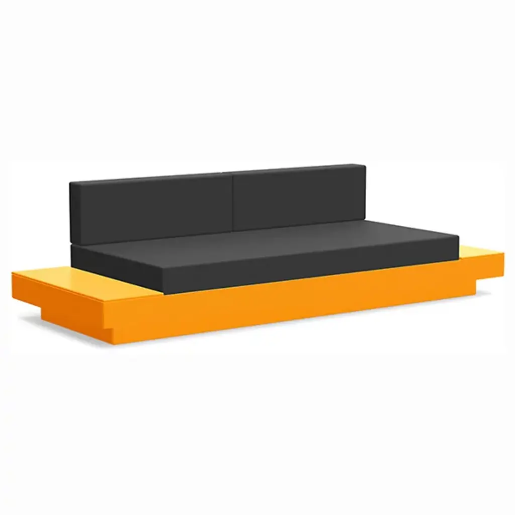 The Platform One Sofa With Tables by Loll Designs brings a modern touch to your lounge areas. Flanked with simple, functional, and convenient side tables, this sofa is the perfect space to sink in and relax with a drink or a snack. The easy to clean and durable Sunbrella cushions are fit into an intentionally deep seating arrangement that is a comfortable complement to the structured base. This base is made from recycled milk jugs and non-recycled HDPE and powder-coated steel uprights and is a durable and eco-conscious combination that will allow this outdoor set-up to last.