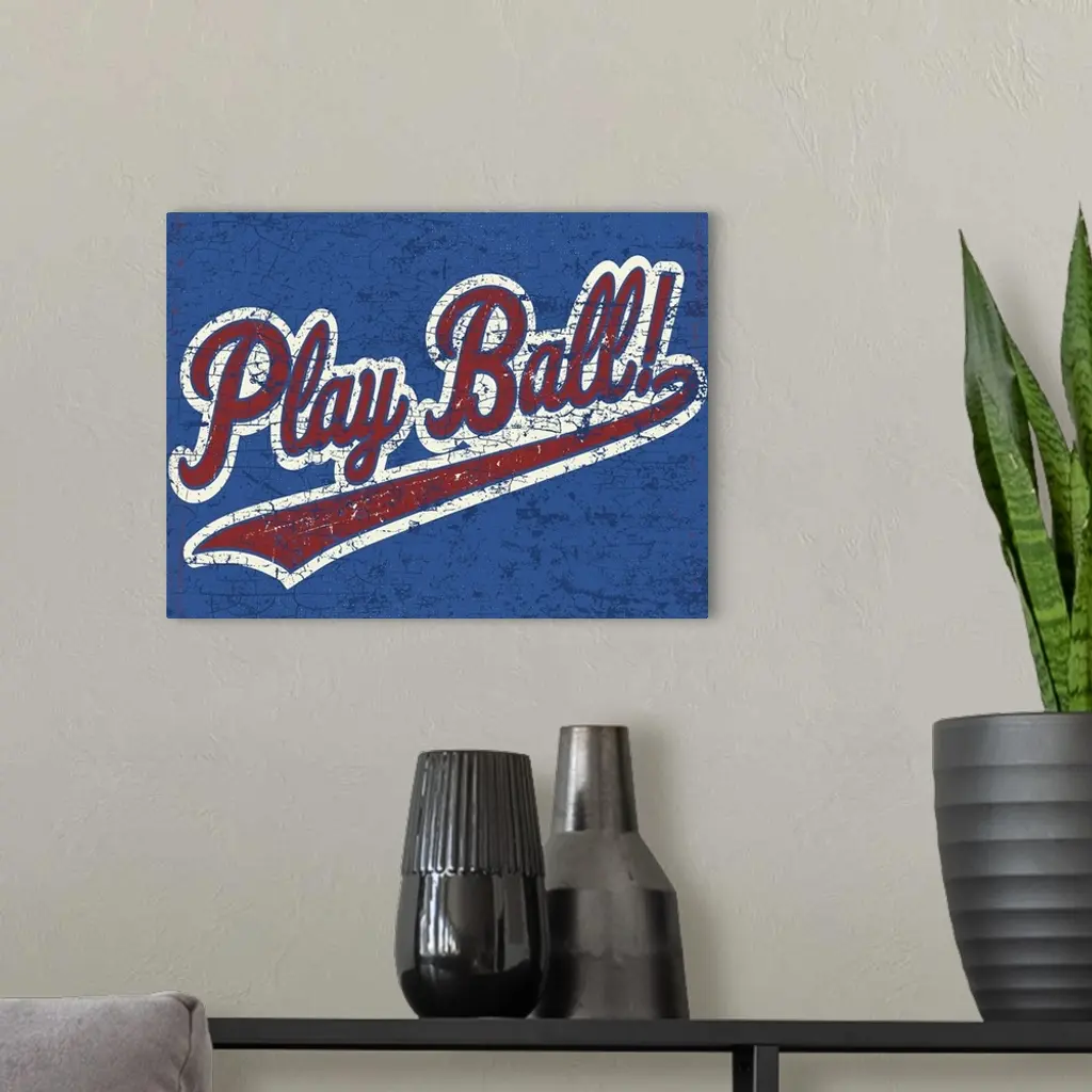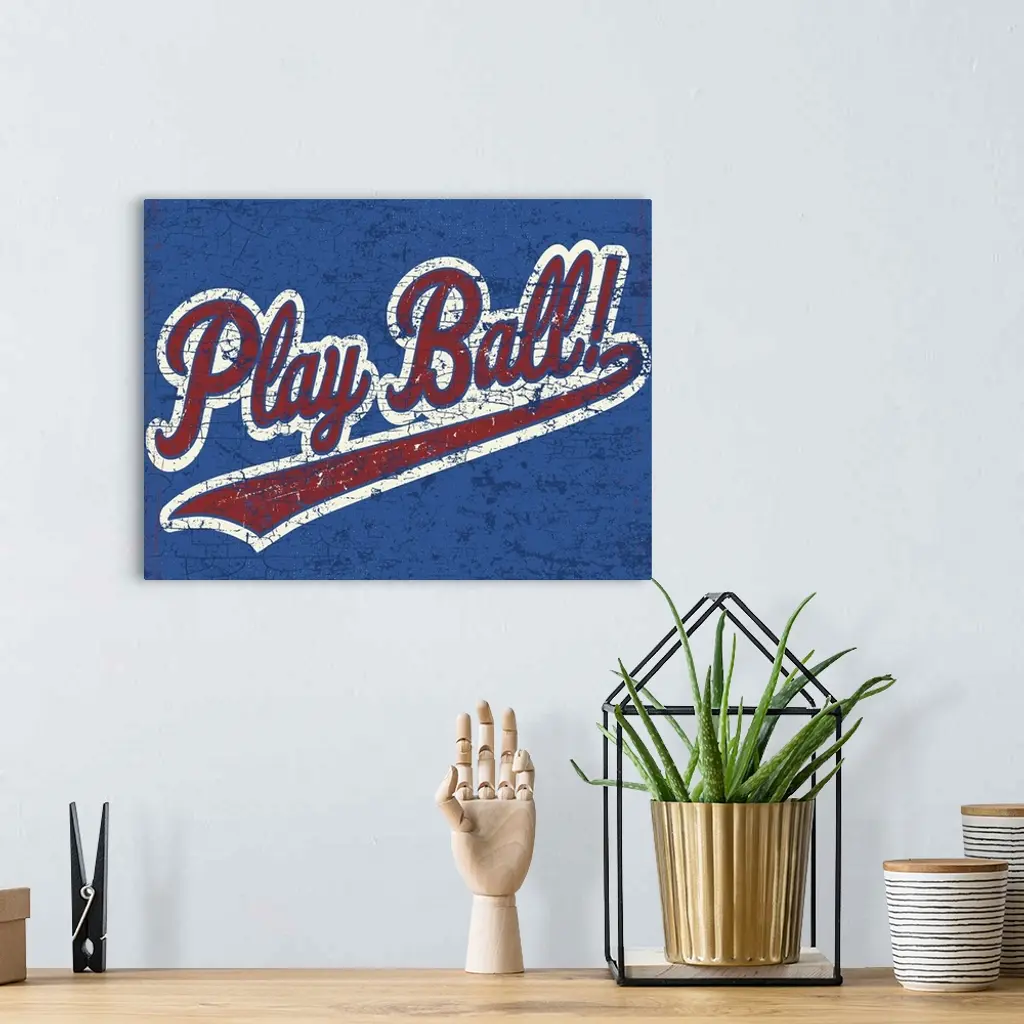 Distressed retro logo image of a baseball logo with the words "Play Ball"