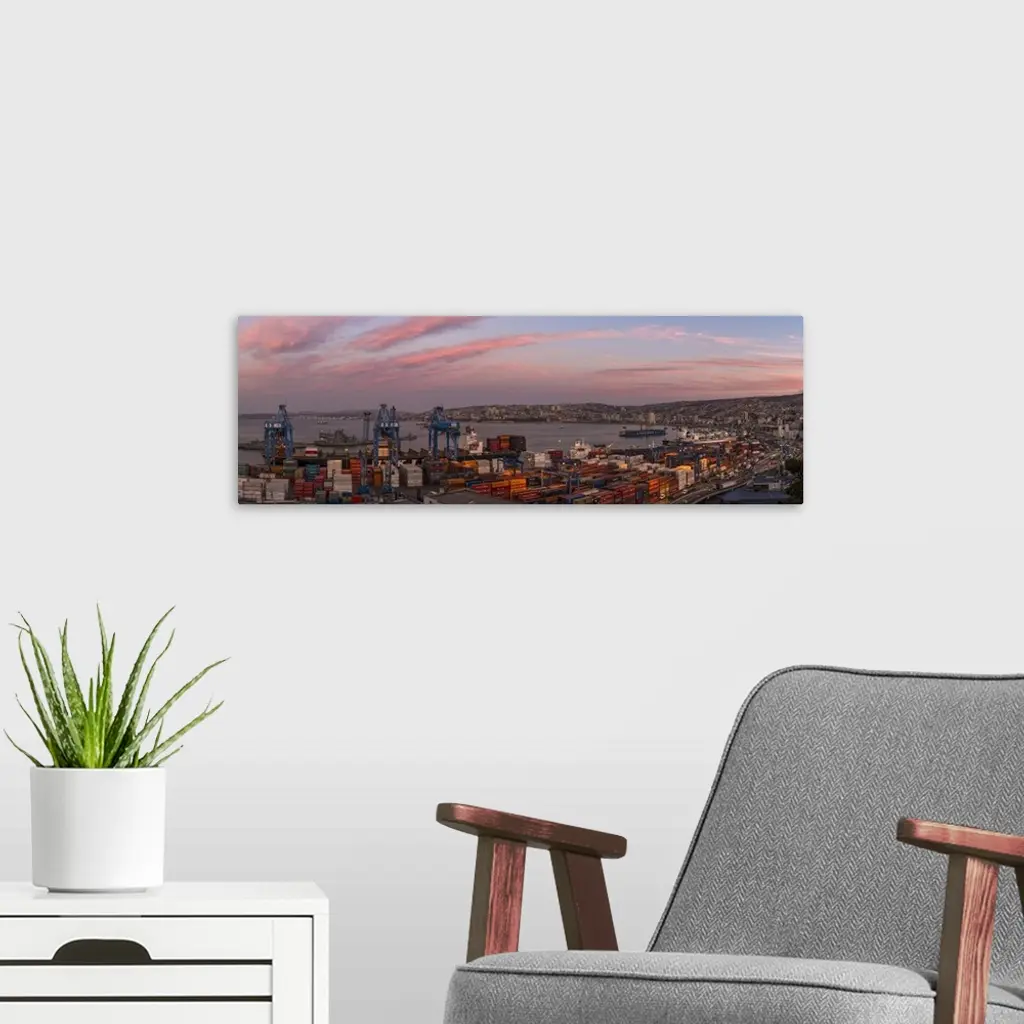 View of city and ports at dawn from Paseo 21 de Mayo, Playa Ancha, Valparaiso, Central Coast, Chile.