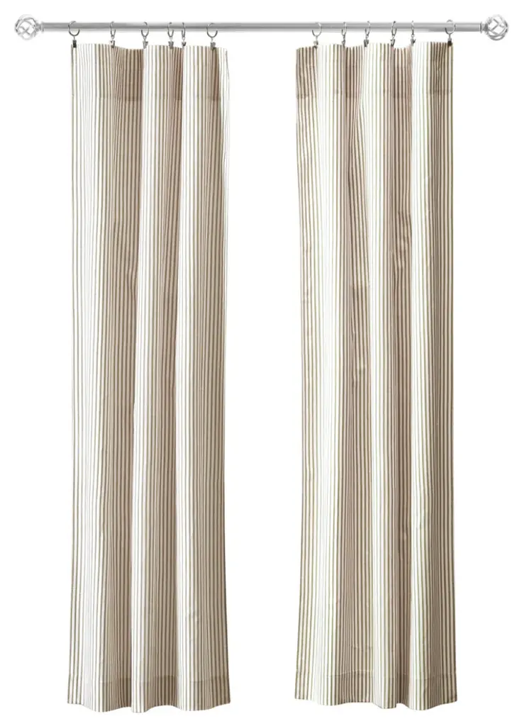 Casual, classic stripes will harmonize all of the elements of your room, bringing style and character. The tailored panel pair is constructed using 50-percent polyester/50-percent cotton duck fabric that creates a smooth draping effect, soft texture and easy maintenance. Each curtain panel is constructed with a 1.5-inch header and 1.5-inch rod pocket. Two tiebacks are included for a different look. Width is measured overall 56-inches (both 28-inch panels together), while length is measured at 63-inches. For wider windows simply add multiply panels together. Easy care machine washable.