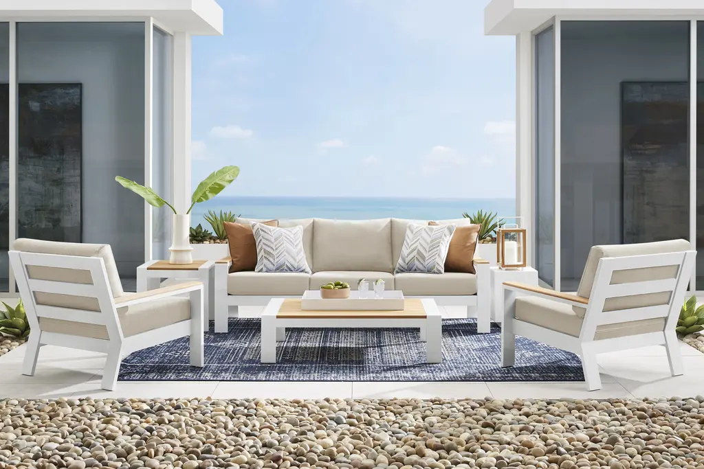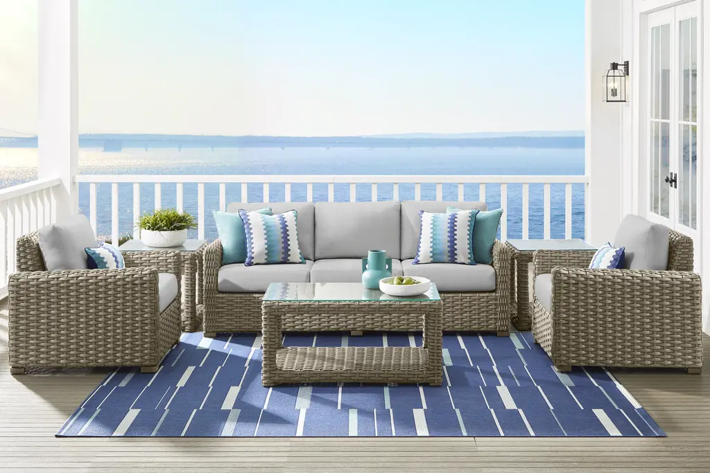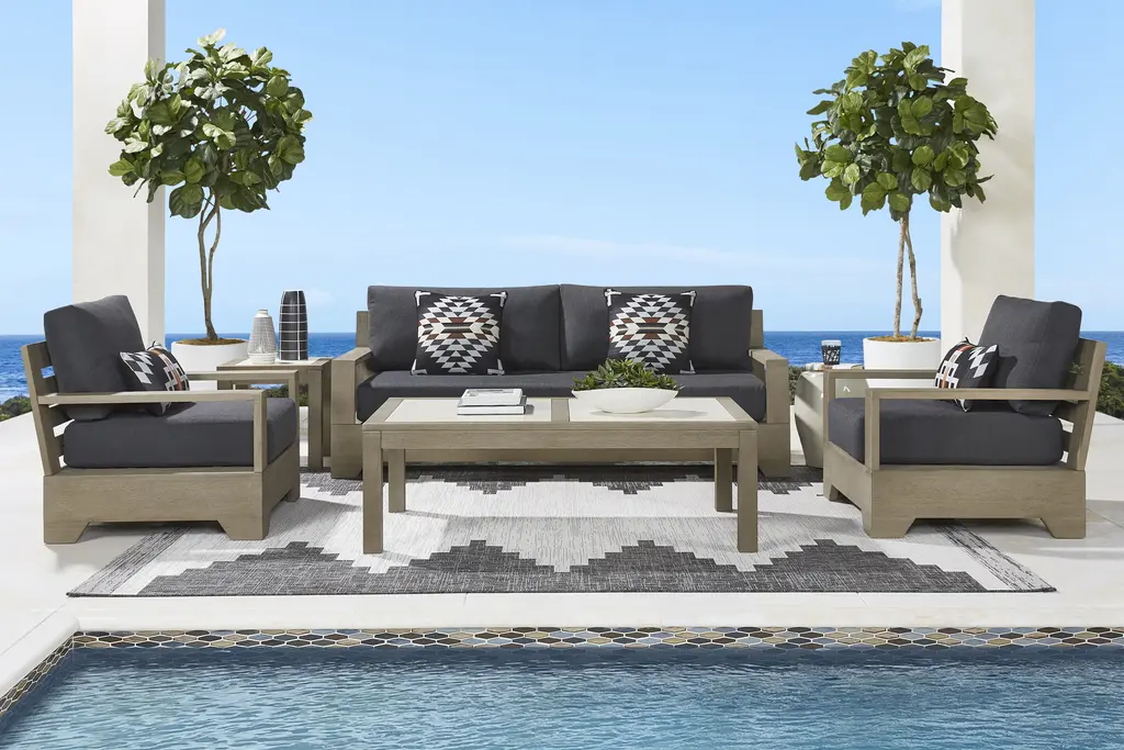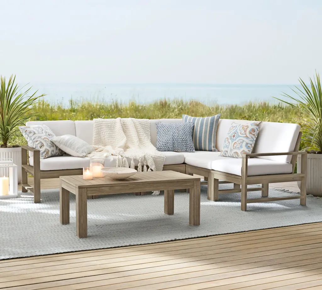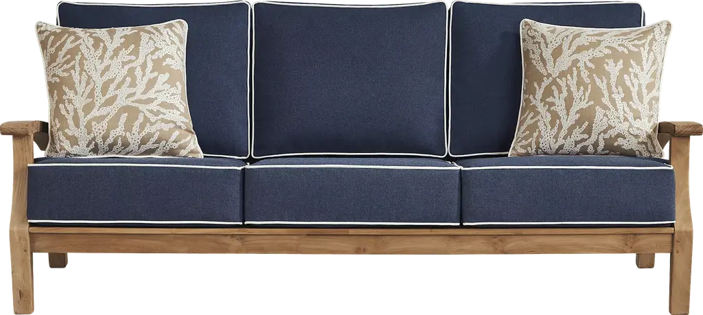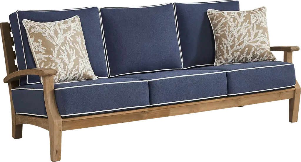 Beautifully designed to make the most of your patio space, the Pleasant Bay collection combines classic lines with a contemporary silhouette. Crafted with solid natural teak, each piece features an open slat back for a breezy, casual feel. Indigo cushions in Sunbrella outdoor fabric feature coordinating welting details and comfortable padding. The cushions are UV resistant and colorfast. Patterned toss pillows add a decorative finishing touch on the sofa. 100% Sunbrella fabric. To clean Sunbrella fabric cushions remove dirt and spray on cleaning solution (water and mild soap), then use a soft bristle brush or sponge. Allow cleaning solution to soak into fabric and rinse thoroughly until soap residue is removed. Air dry. Do not dry clean. Cocktail table not included.