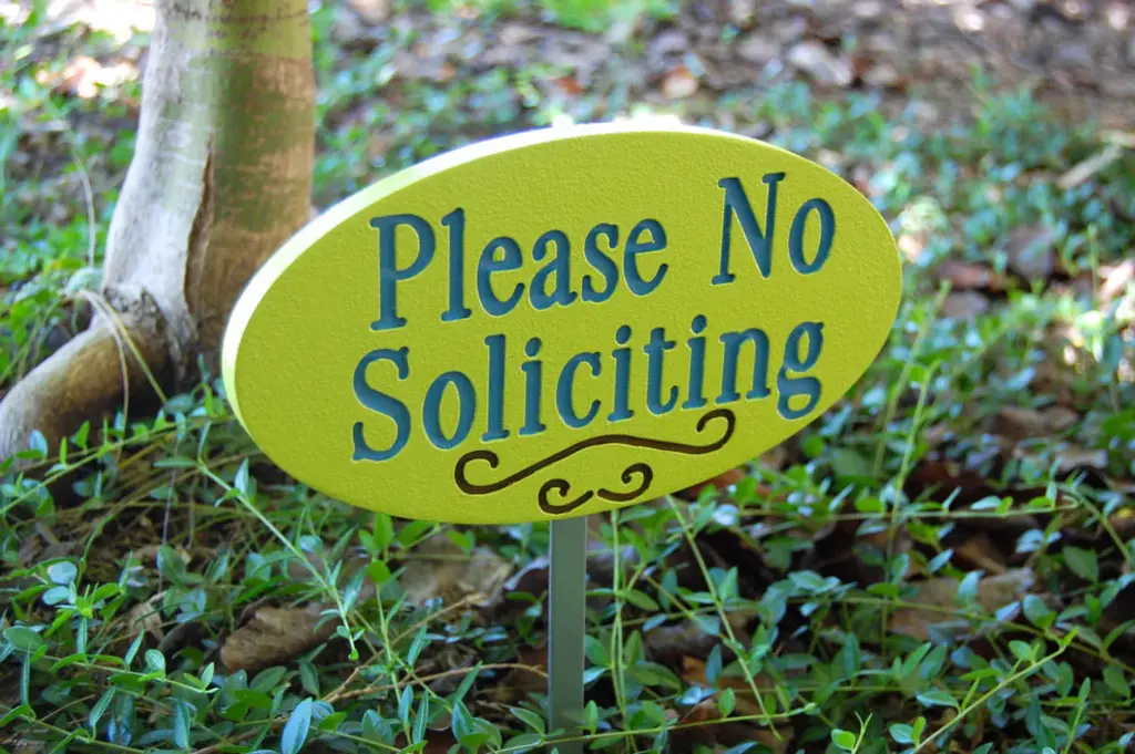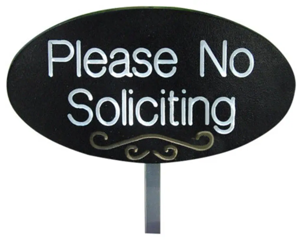 Product Details:Are you getting pesky solicitors at your door? This sign politely lets them know that you''re not interested."Please No Soliciting" is engraved on an oval wood plaque and painted in lime green with the engraving painted blue and design in dark brown.The sign comes with a steel stake that extends 7" from the bottom of the sign. This sign looks great placed in a planter or staked in the walkway grass. The sign measures 9" long, 5" wide and is cut from 1/2 wood. All of my signs are engraved on outdoor grade sign wood that is resin coated to keep the wood from splintering or fading. I hand paint each sign with 2-3 coats of exterior paint and seal with a UV protectant, weather resistant sealer on both the front and back of the sign.