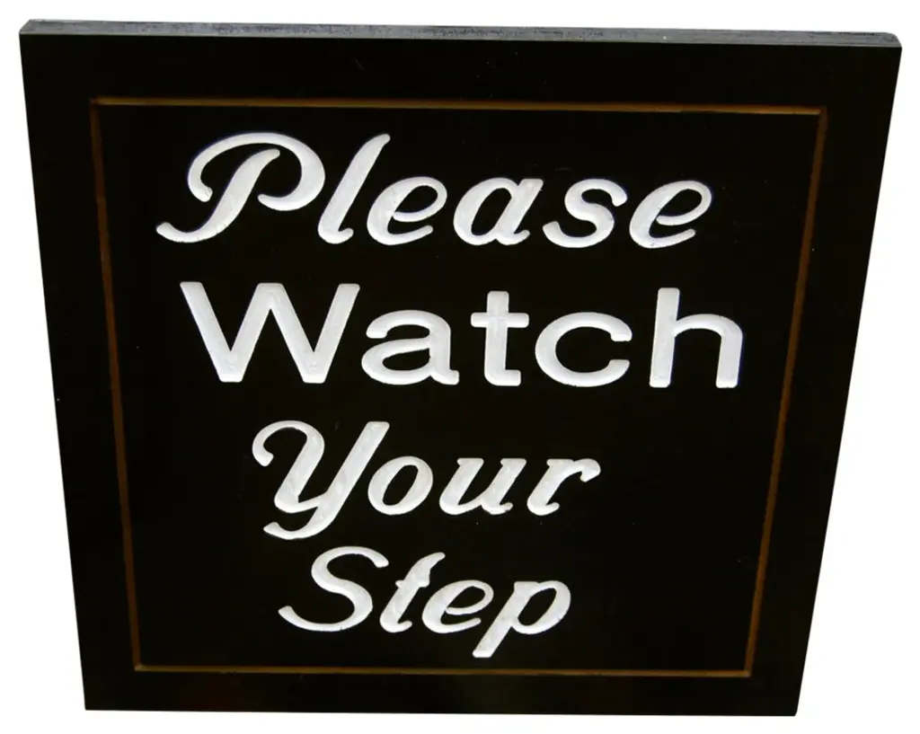Keep your guests from tripping with this eye catching "Please Watch Your Step" wood sign.The sign measure 12 inches square, is painted black with the words engraved and painted white and encased by a golden brown engraved border. The back of the sign is painted black and comes with a steel stake. Details:- cut out of high quality resin coated wood made for outdoor sign use - hand painted with high gloss exterior paint- sealed front and back with an all weather sealer - includes a steel stake that extends 7" from the bottom of the sign and two screws. The holes are predrilled for easy assembly.