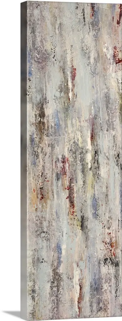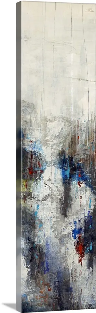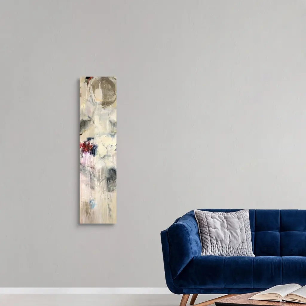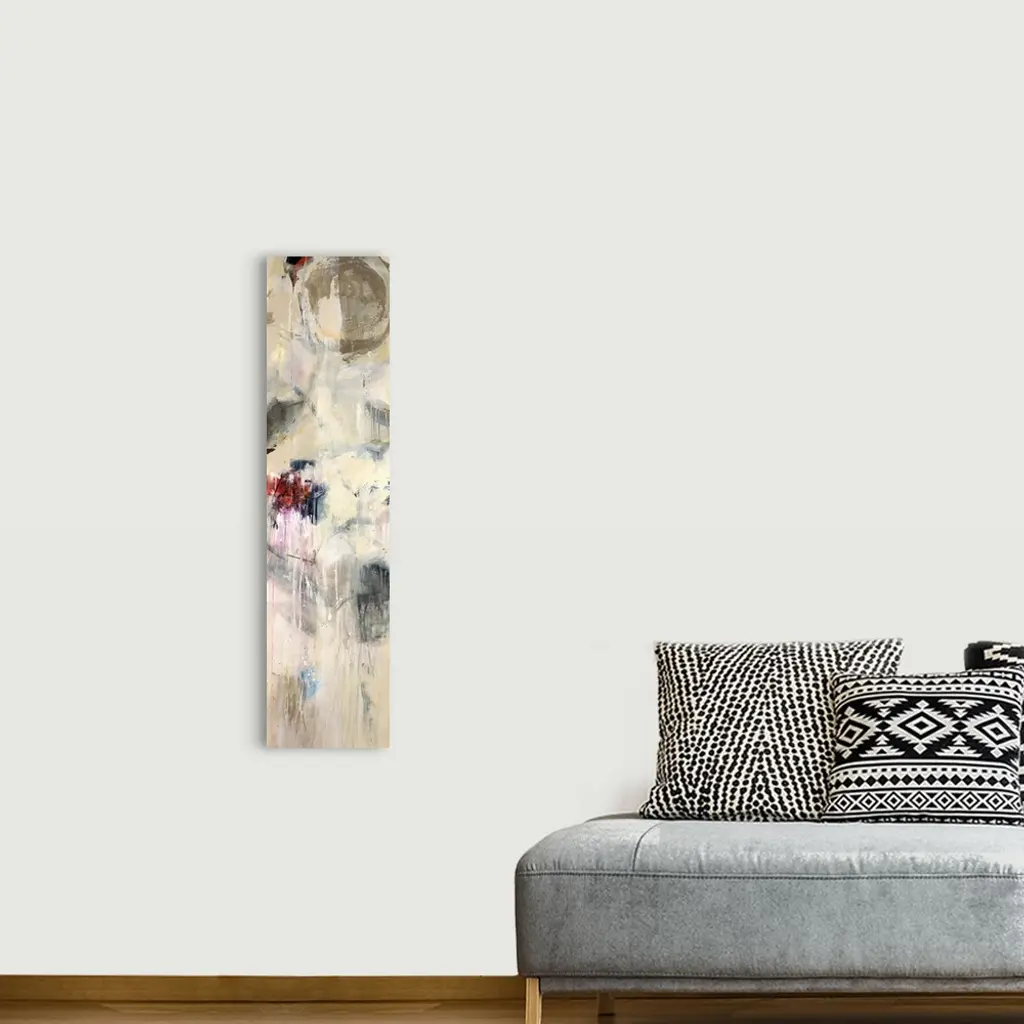 A very tall panoramic abstract piece that uses lots of neutral colors with a few pops of red.