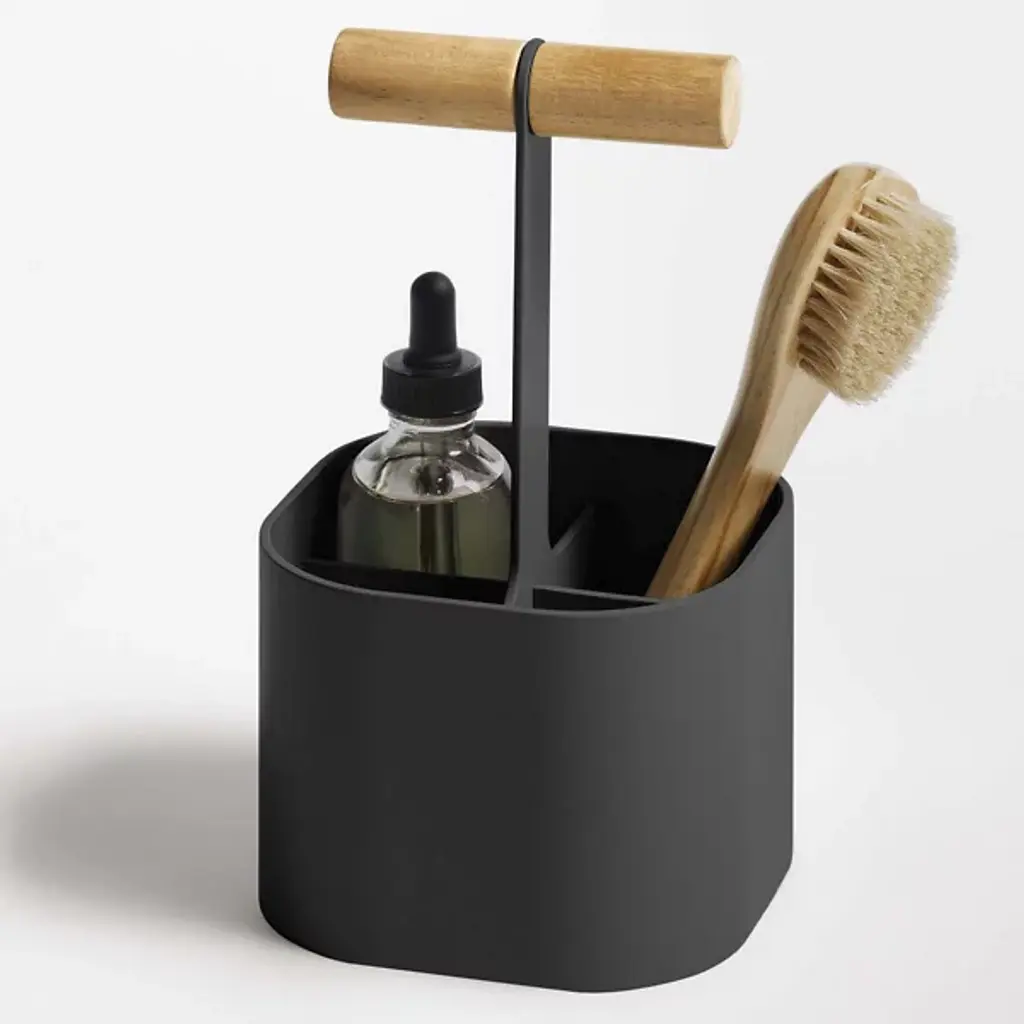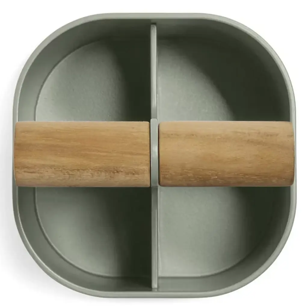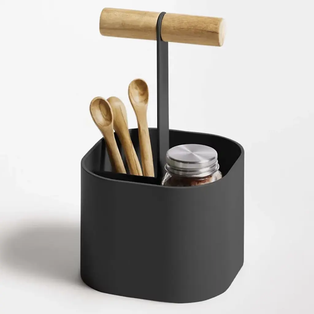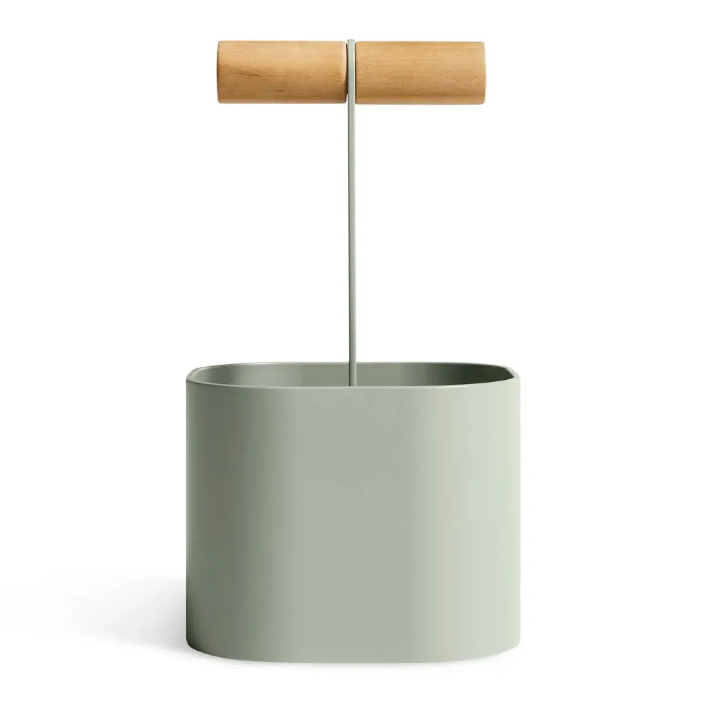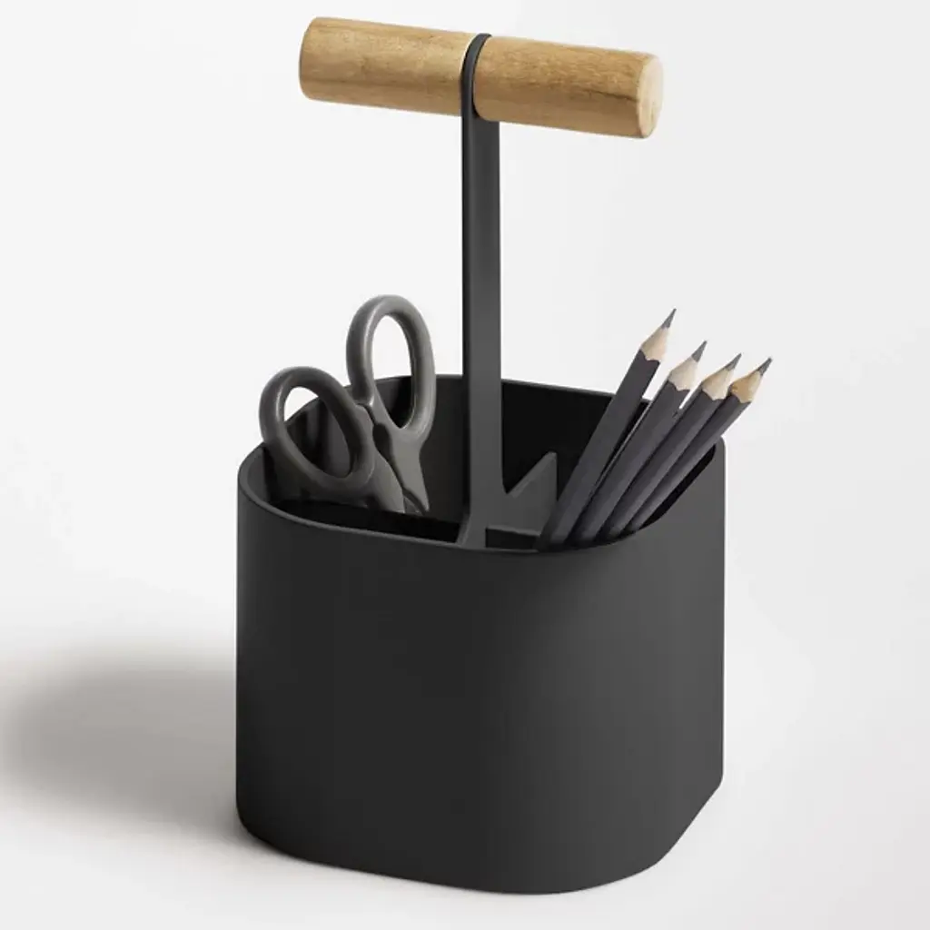 Provide lasting storage in style with the smooth, inspired appeal of the Pluck Caddy from Blu Dot. A rounded aluminum construction creates a memorable contemporary appeal. The curve-cornered body supports a single vertical metal column emerging from its center, using cylindrical handles of responsibly sourced, tough teak wood to provide a gorgeous, gripping surface. Its natural woodgrain contrasts well with the powder-coated aluminum body below, both surfaces offering a simple and strong appeal with a touch of artistic intricacy.