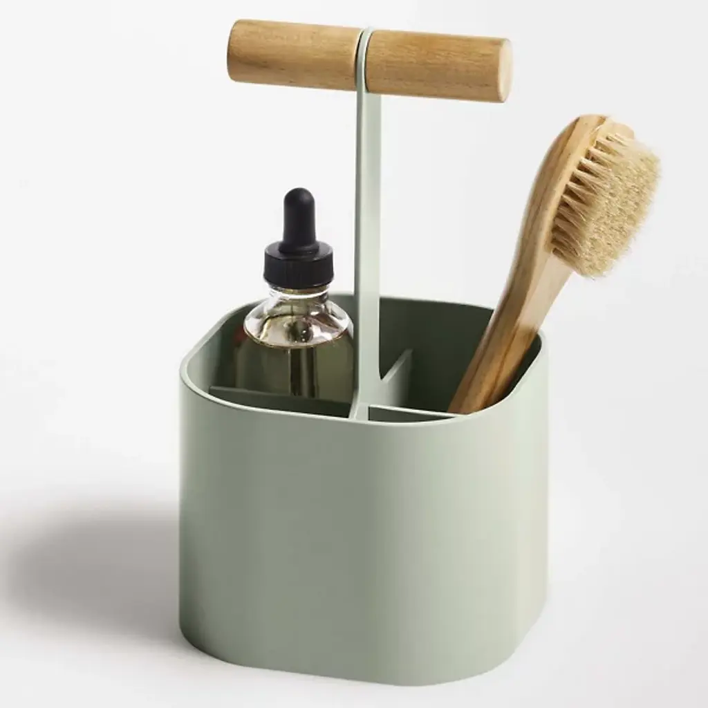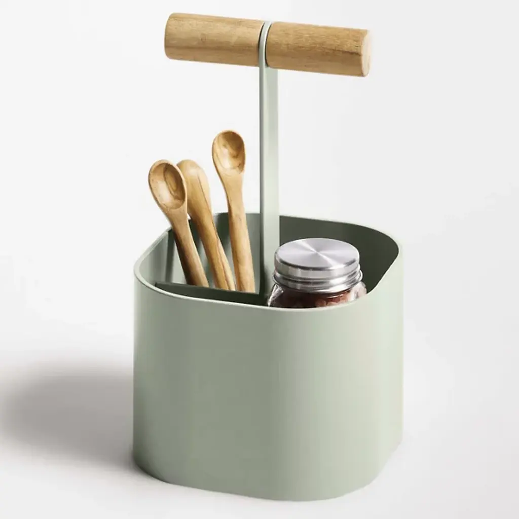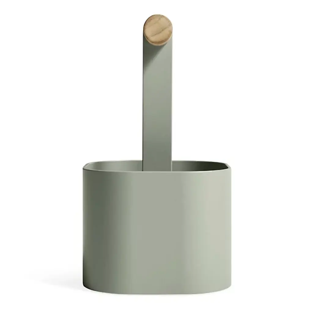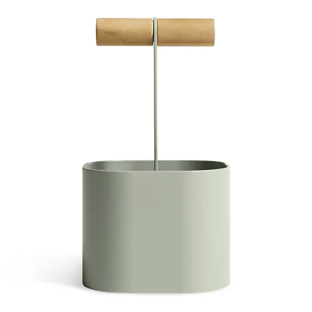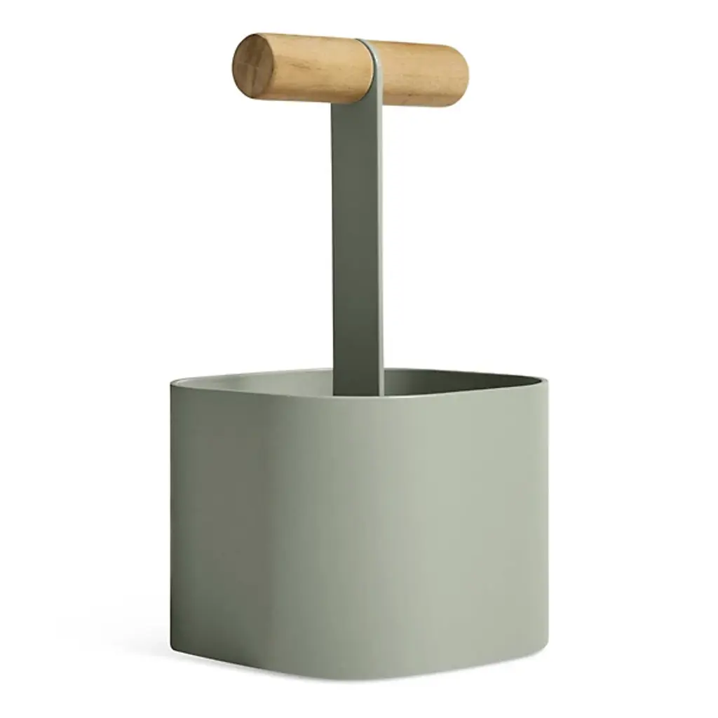 Provide lasting storage in style with the smooth, inspired appeal of the Pluck Caddy from Blu Dot. A rounded aluminum construction creates a memorable contemporary appeal. The curve-cornered body supports a single vertical metal column emerging from its center, using cylindrical handles of responsibly sourced, tough teak wood to provide a gorgeous, gripping surface. Its natural woodgrain contrasts well with the powder-coated aluminum body below, both surfaces offering a simple and strong appeal with a touch of artistic intricacy.