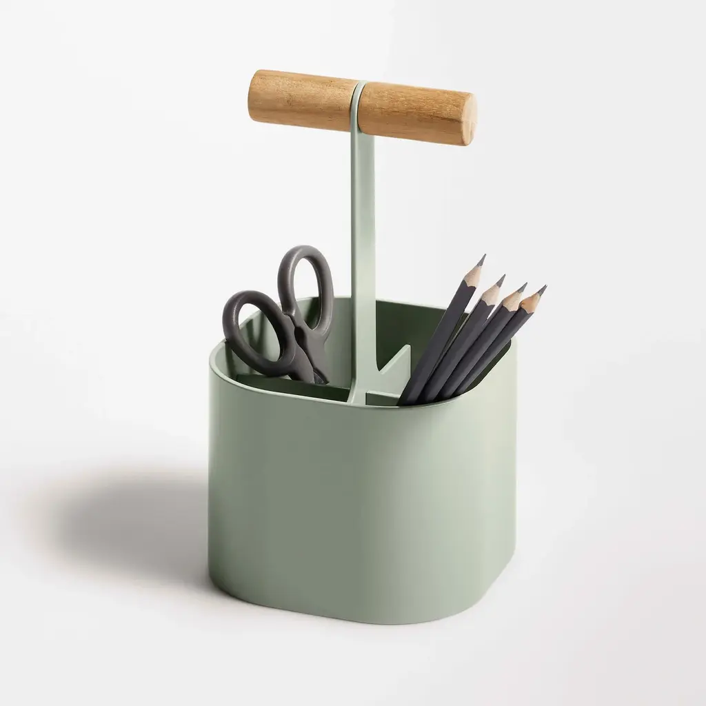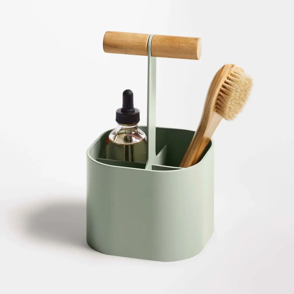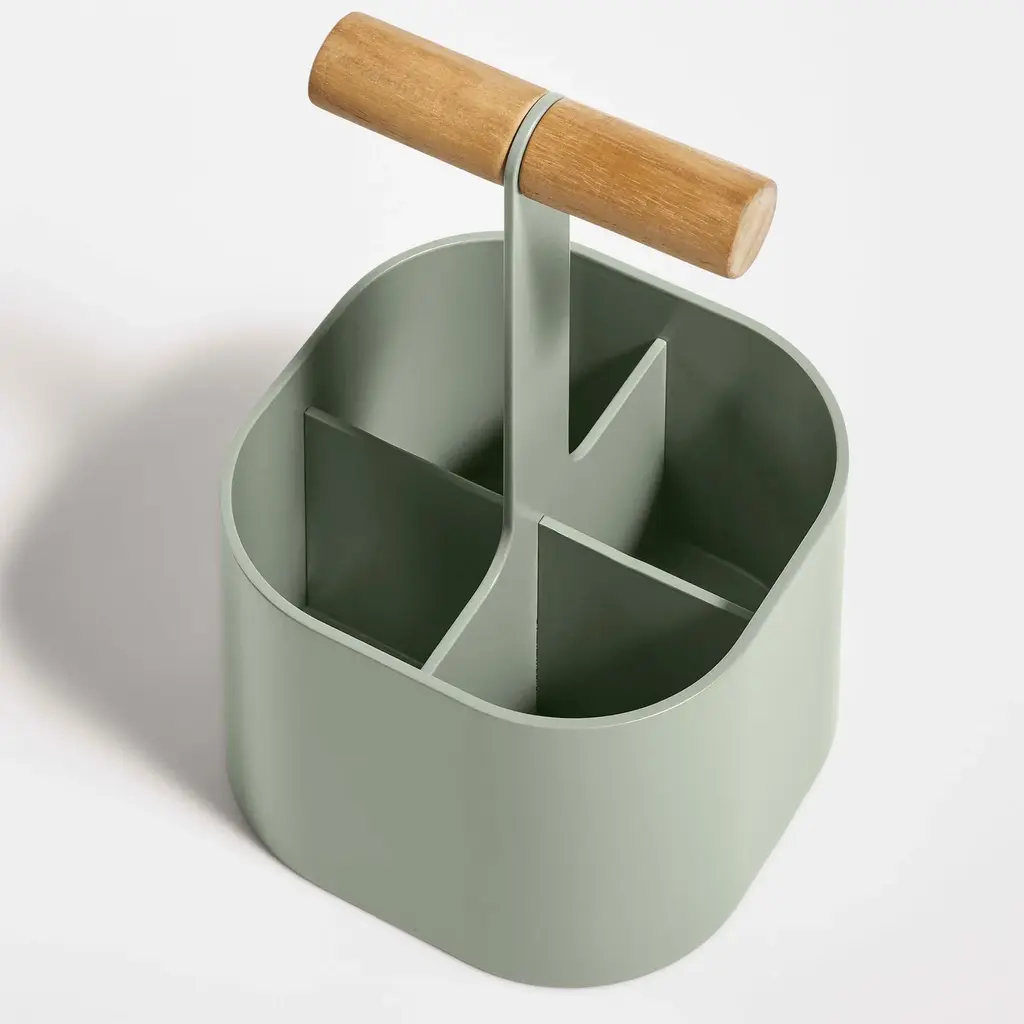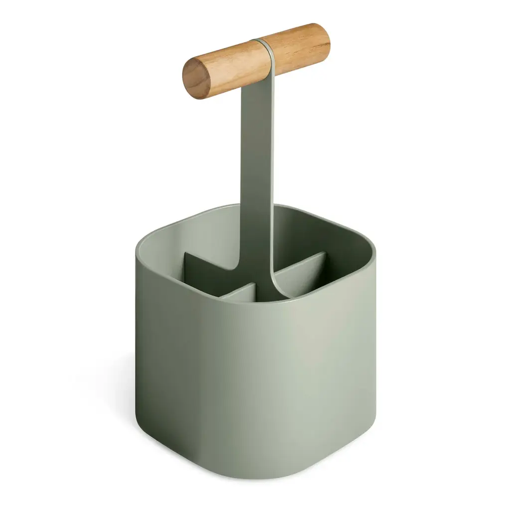 FSC®-certified teak wood handle adorns powder-coated aluminum to give this intrepid caddy a little flair and a good deal of functionality. Holds toothbrushes, art supplies, essential oils, more art supplies.