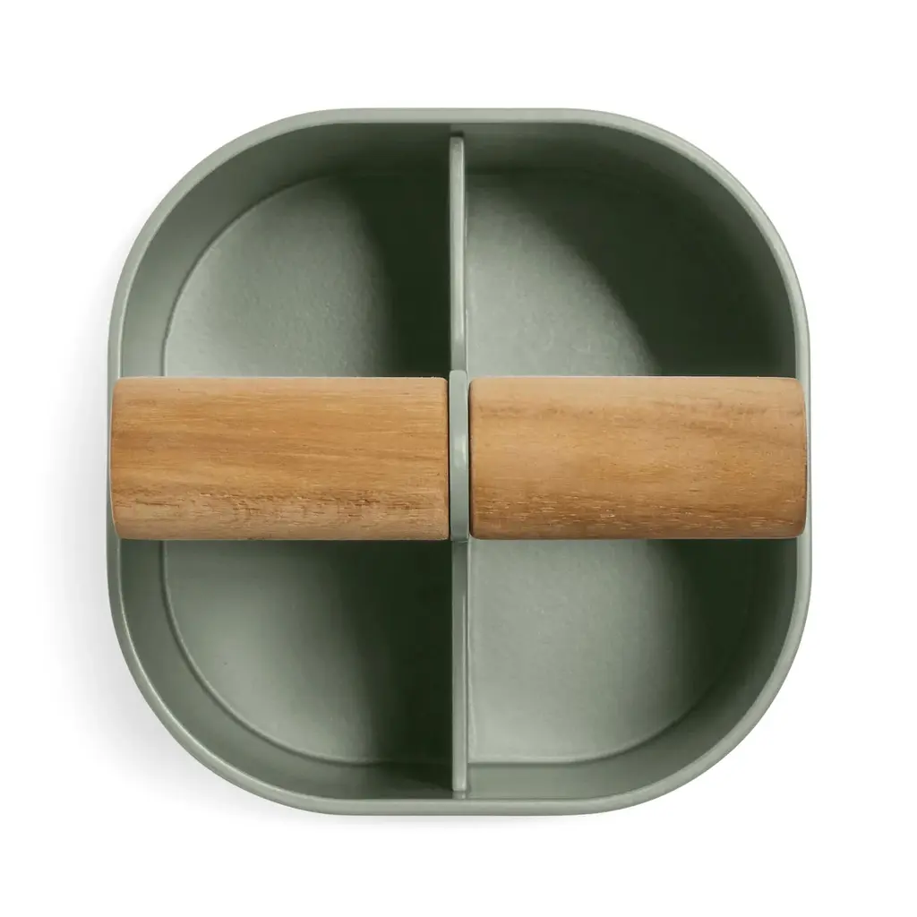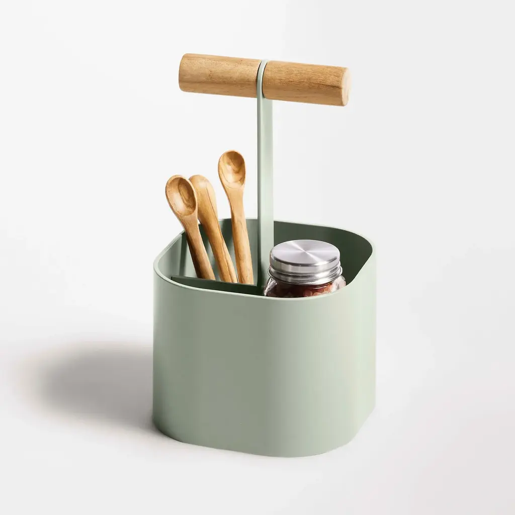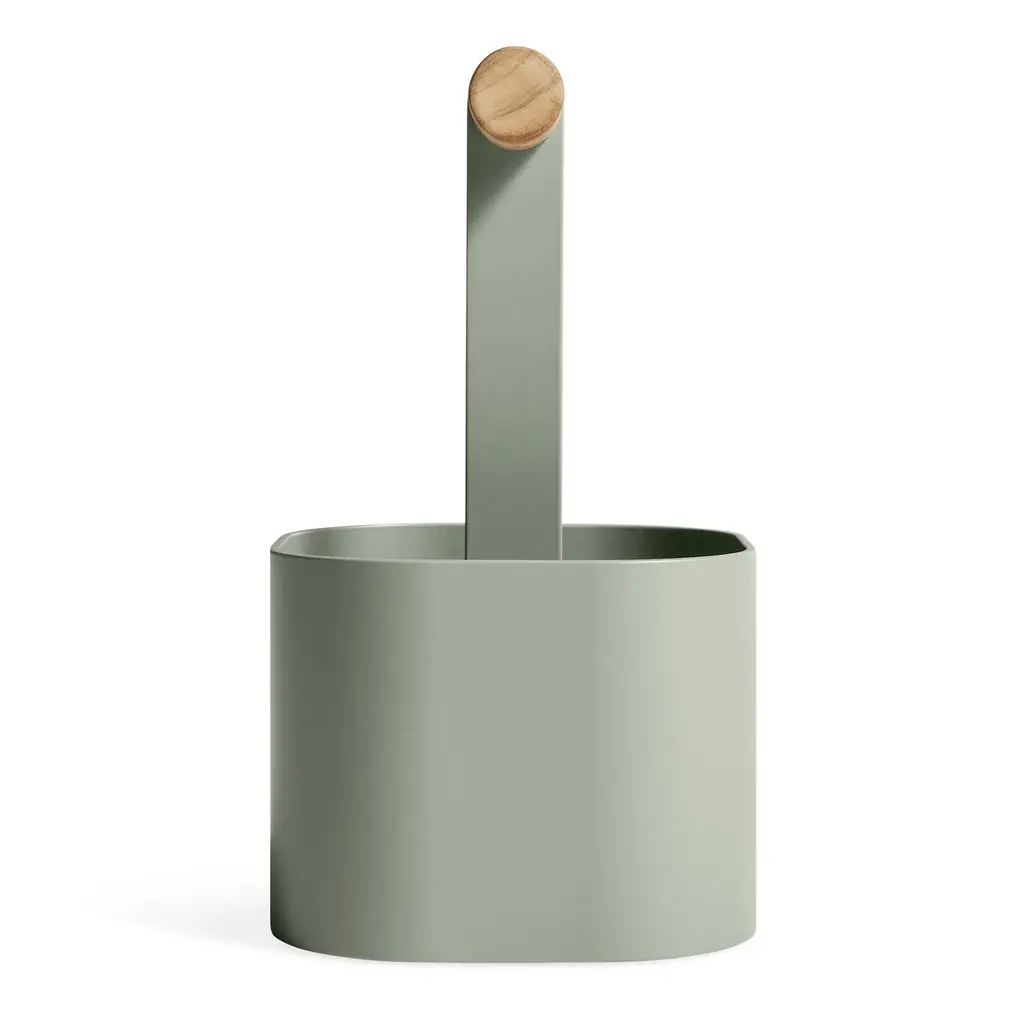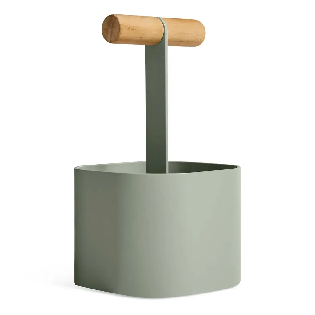 FSC®-certified teak wood handle adorns powder-coated aluminum to give this intrepid caddy a little flair and a good deal of functionality. Holds toothbrushes, art supplies, essential oils, more art supplies.