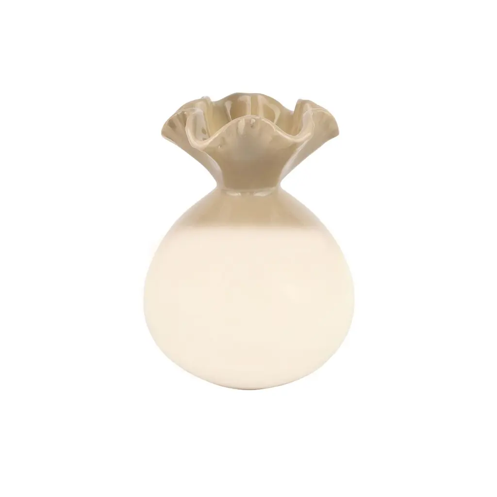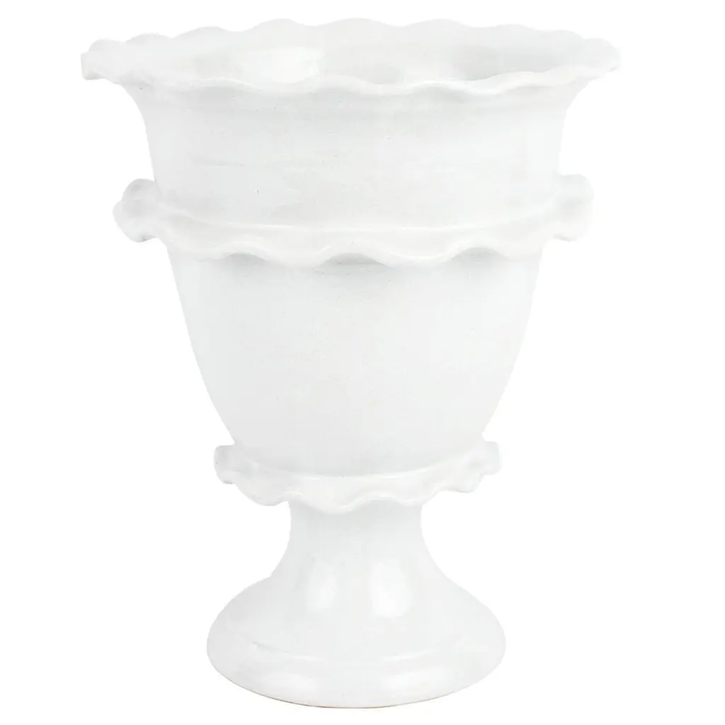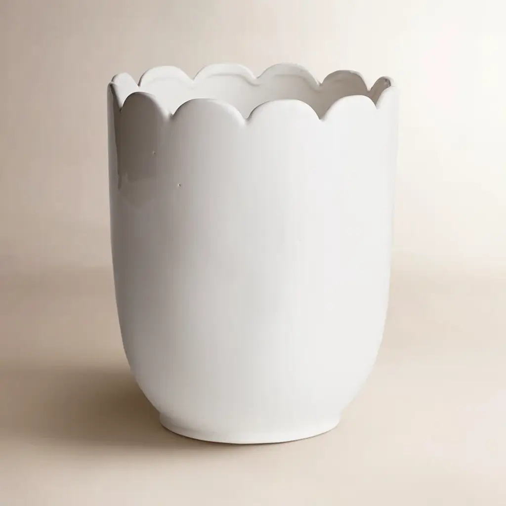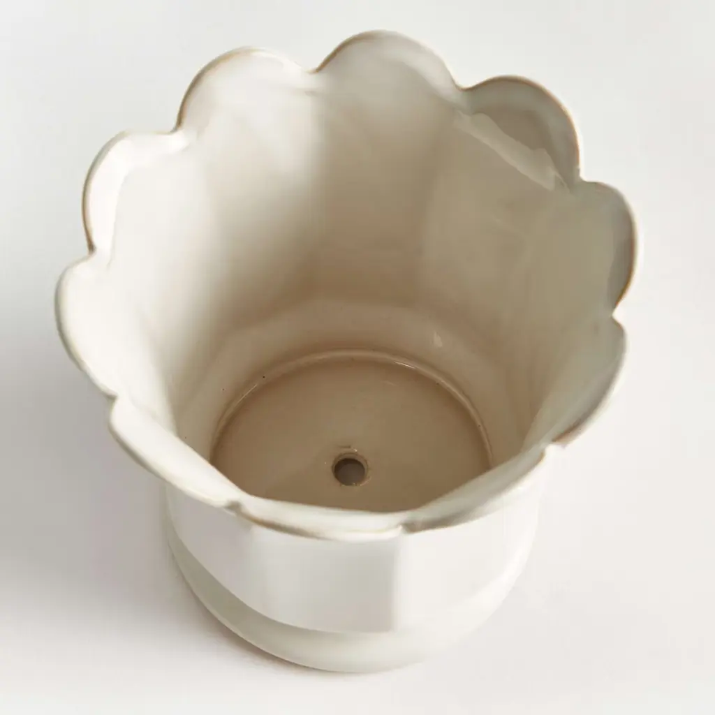 In a classic silhouette with petal edges, this footed pot is nature-inspired. Finished in a soft white reactive glaze, it is a great way to add a touch of color to any space.