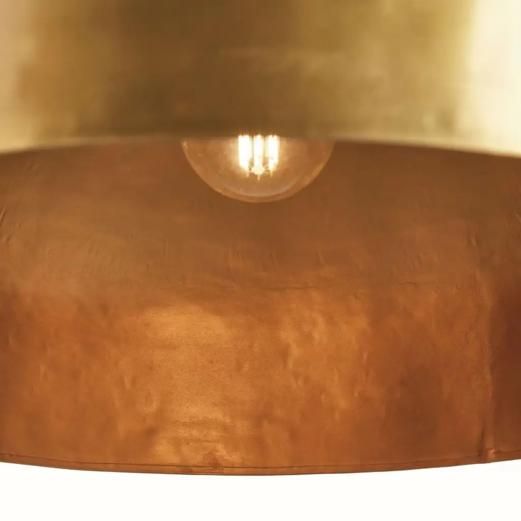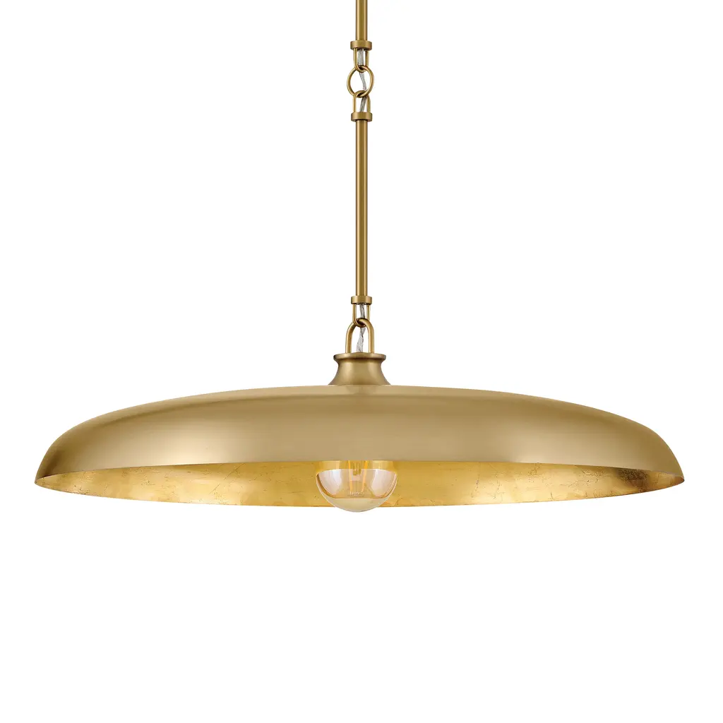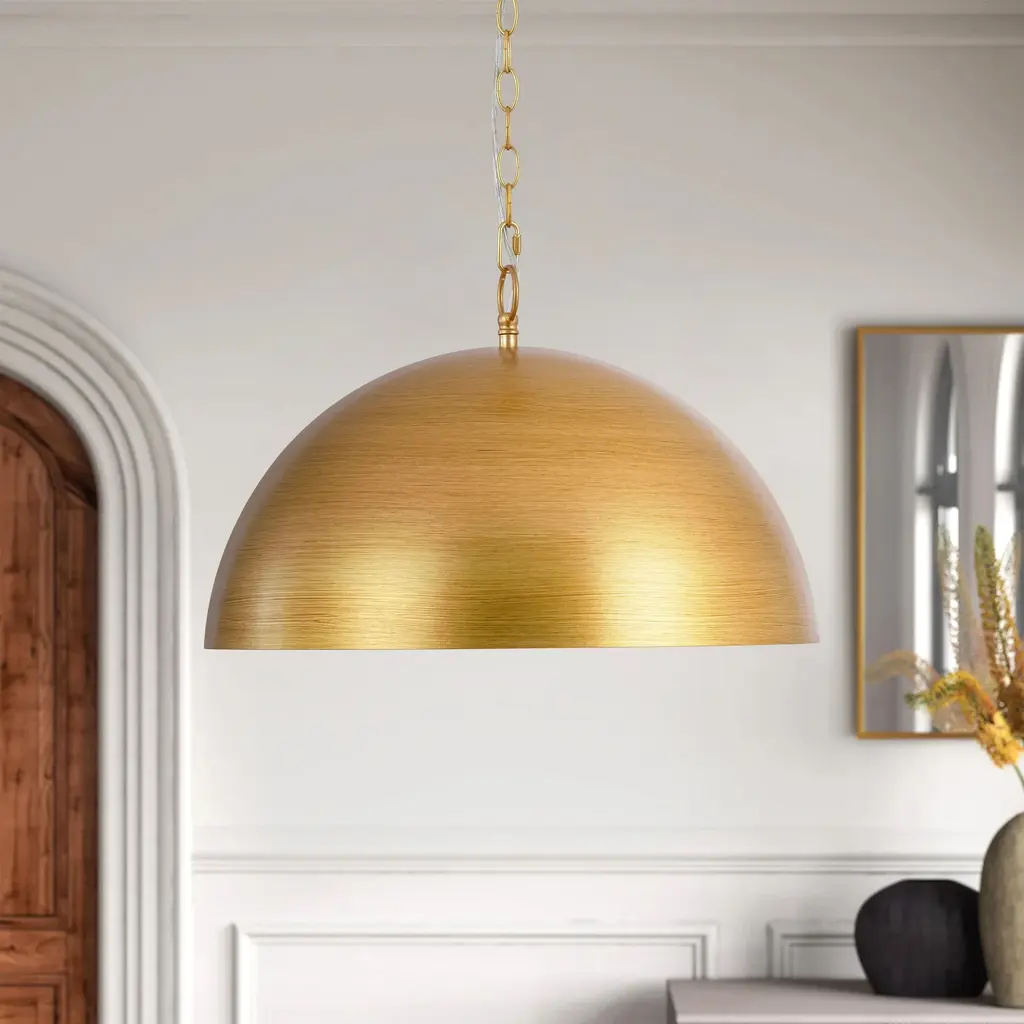 A modern statement-worthy pendant with a lightly pounded textured metal dome shade. Finished in a warm champagne tone, this pendant is at home in the contemporary setting.