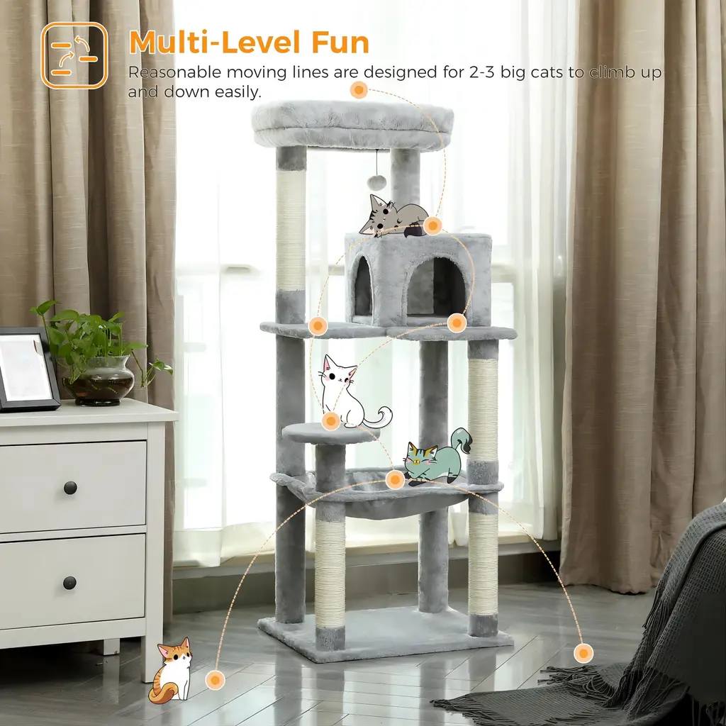 Introducing our Plush Double Door Apartment Cat Tree with Sisal Rope Panels. Thoughtfully designed with 6 tiers, this cat tree is perfect for 2-3 large cats. Each tier is generously spaced to provide plenty of space for larger or heavier cats to rest and play. Replaceable pom-poms and sturdy construction ensure your furry friend can play and lounge without worry. Product Features: