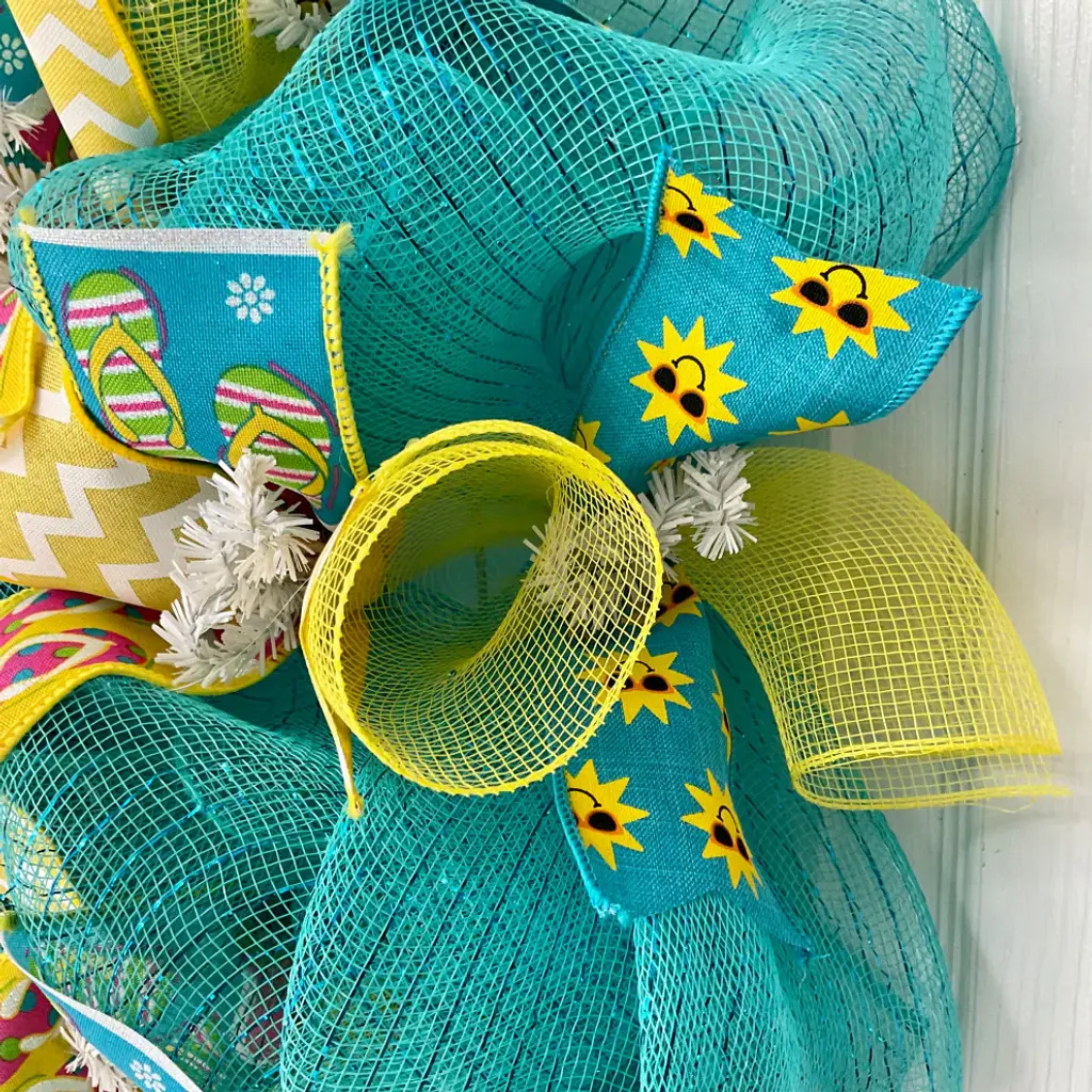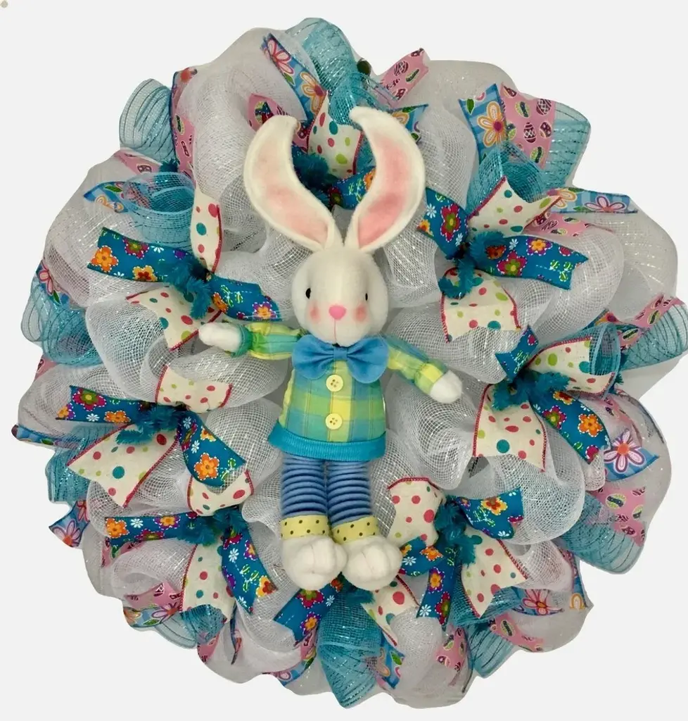 Adorable, handmade deco mesh Easter Bunny wreath. Adorable plush, plaid vested, white Easter bunny, with large ears and dangling, springy coiled legs sits on white Iridescent, durable deco mesh. Premium white linen ribbons with pastel polka dots and blue, colorful flower ribbons surround the center. The outer ring has gorgeous Easter egg ribbons, Bright flowered ribbons and shimmering, metallic robin blue mesh flutes. The size is 24 inch diameter and 6 inches deep.