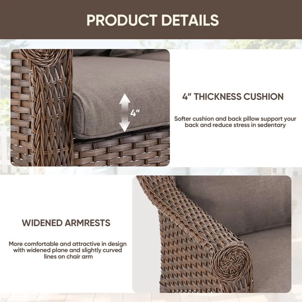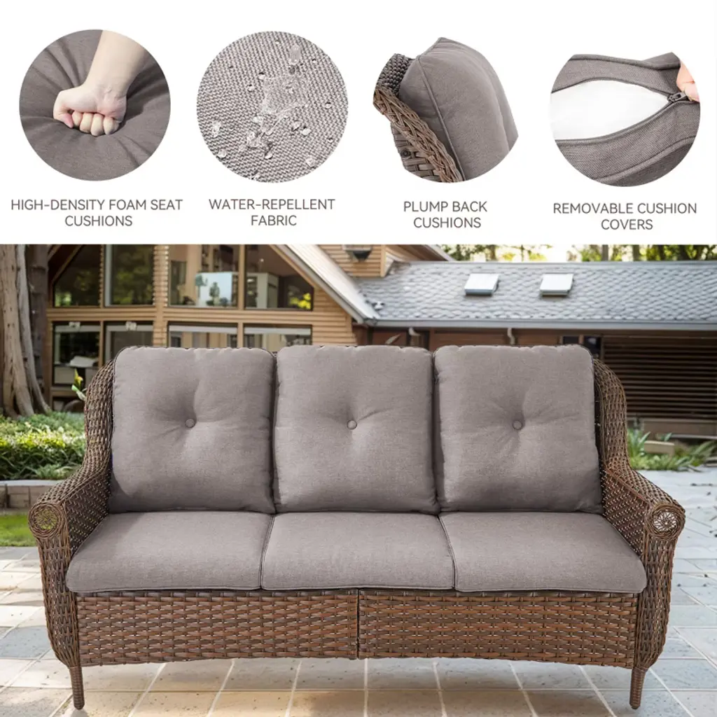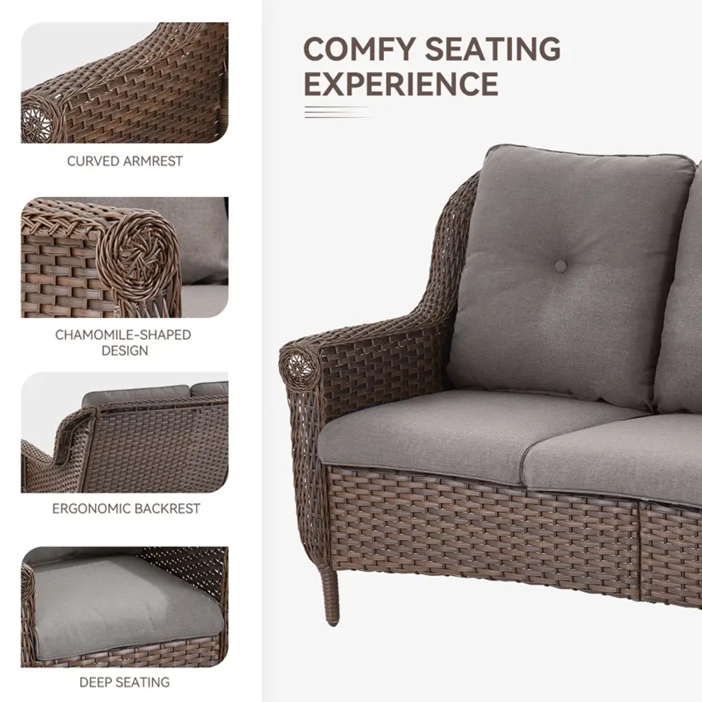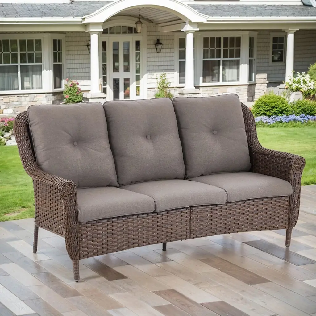 Upgrade your outdoor living area with the POCASSY Wicker Patio 3-Seater Sofa, a perfect blend of durability and comfort. Built with a robust powder-coated steel frame and hand-woven PE wicker, this sofa is designed to withstand the elements while maintaining its elegant appeal. Featuring plush thick cushions and ergonomically designed 4" curved armrests, it delivers exceptional comfort and support, making it ideal for luxurious lounging or intimate gatherings. Whether you're enjoying a quiet evening or hosting friends, this stylish and resilient patio couch transforms your outdoor space into a cozy retreat for relaxation and entertainment.