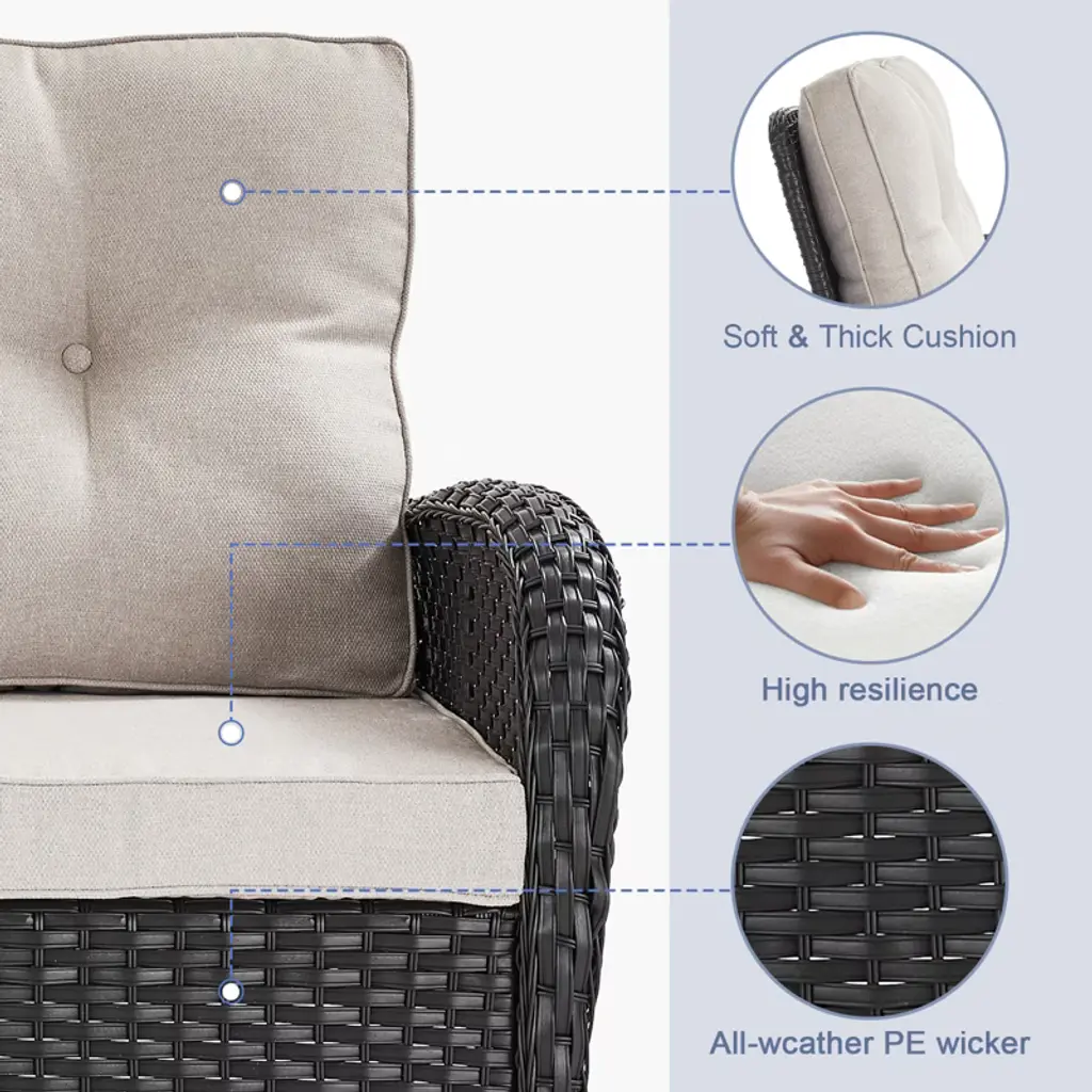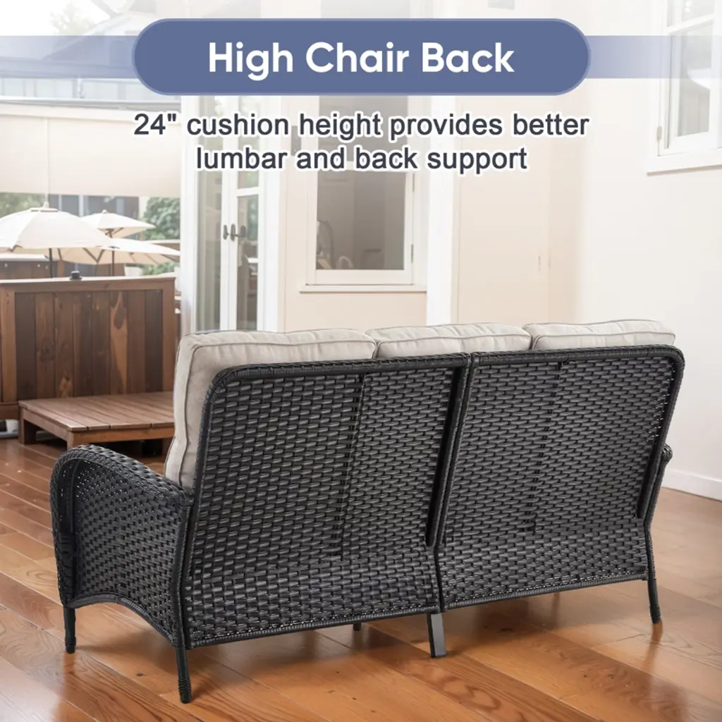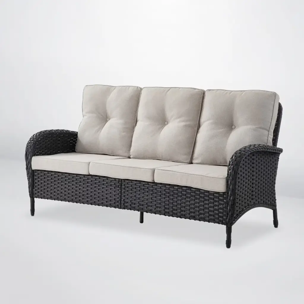 Elevate your indoor and outdoor spaces with the POCASSY Wicker Patio 3-Seater Sofa, a perfect fusion of comfort and style. Built with a sturdy powder-coated steel frame and hand-woven resin wicker, this couch offers both durability and elegance. Complete with plush cushions and a high curved armrest, it provides exceptional head and neck support, making it the ideal choice for your year-round relaxation needs.