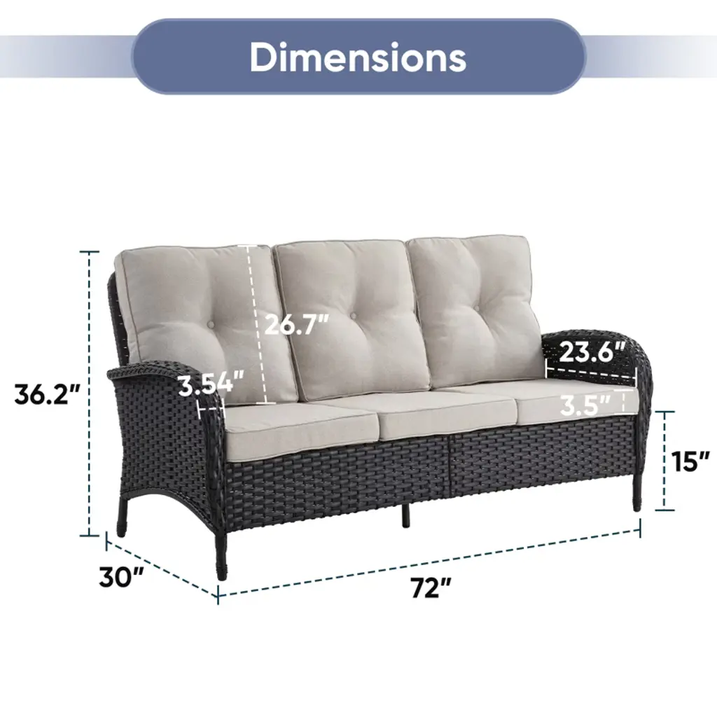 Pocassy 72" Wide Outdoor Wicker Sofa Patio Couch With Cushions, All Weather Gray Wicker 3 Seater Sofa Couch For Porch, Deck, Balcony, Beige