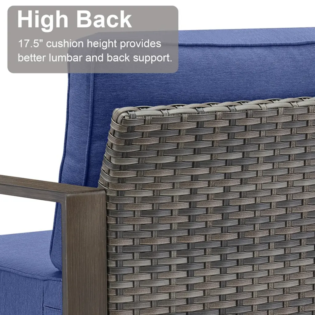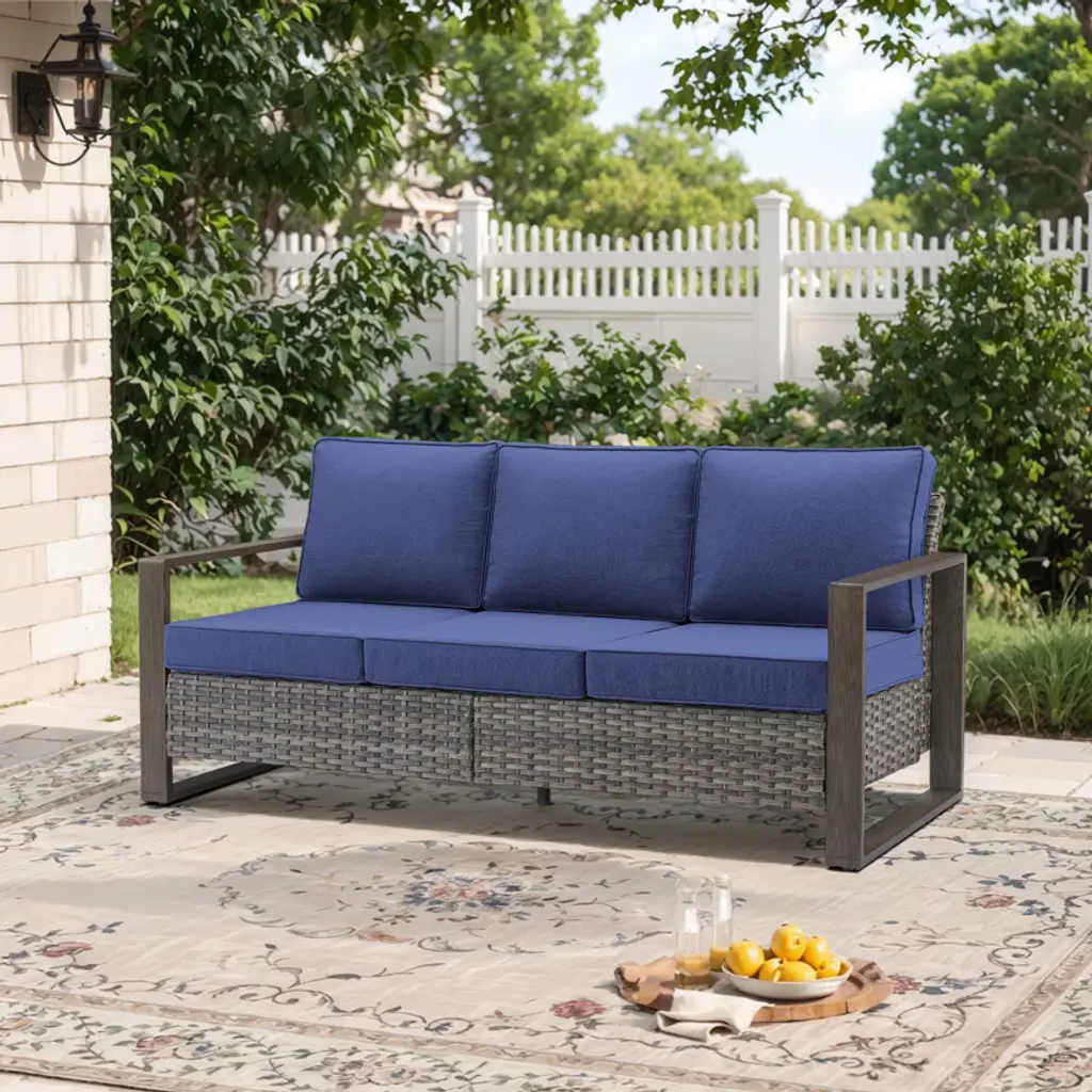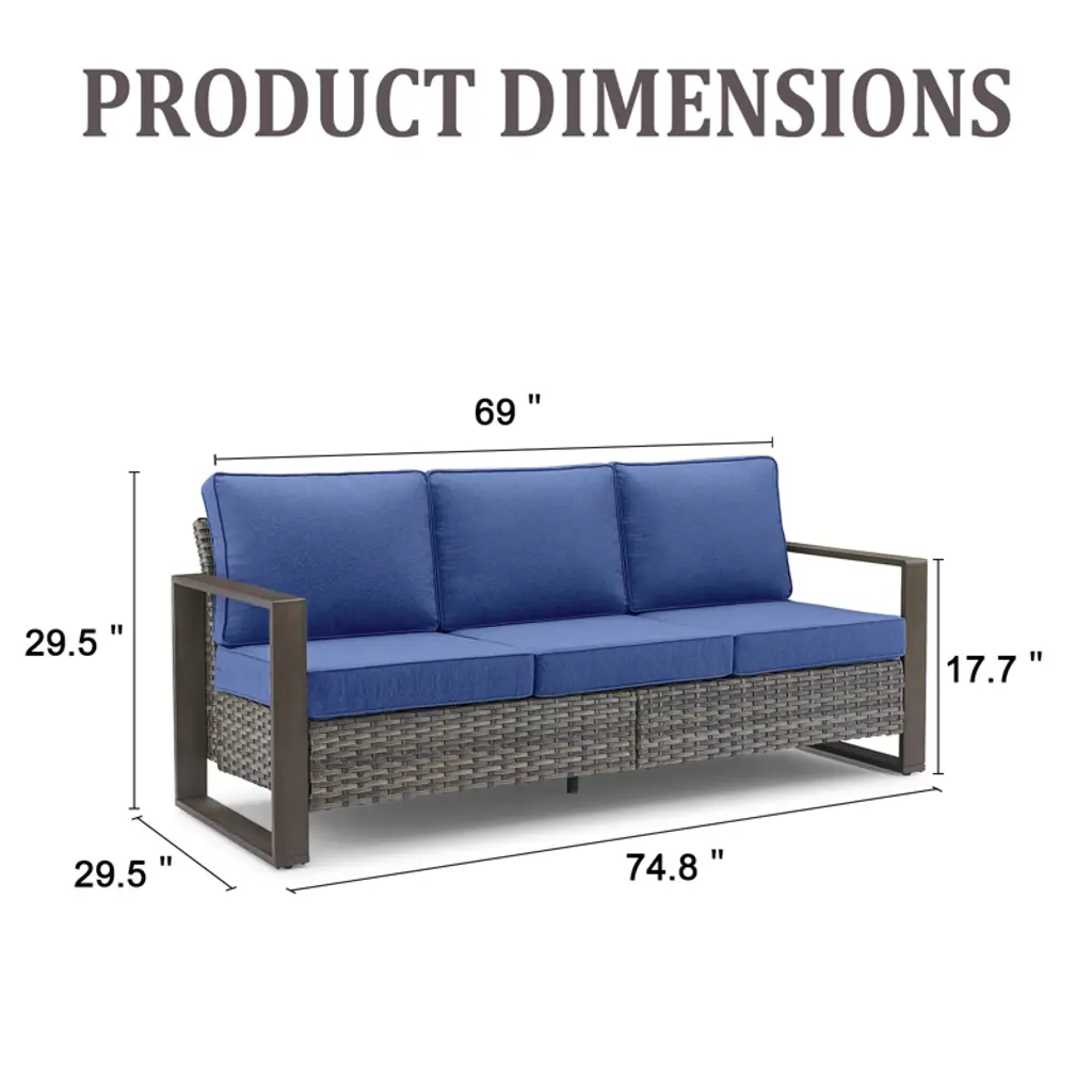 Pocassy 74.8" Outdoor 3-seater Sofa With Meatl Armrest, Outdoor Furniture Sofa With Faux Wood Square Armrest And High Back For Porch Deck, Blue