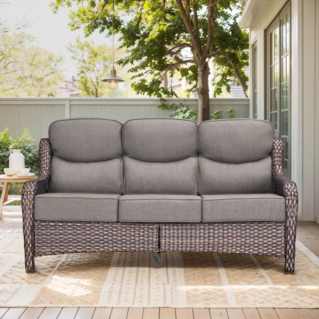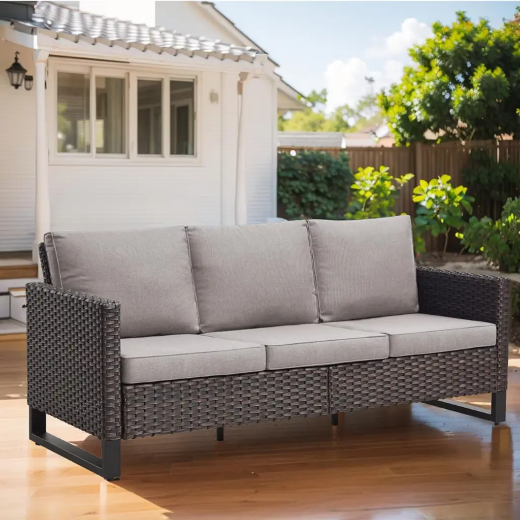Pocassy 74" Wide Outdoor Wicker Patio Sofa With Cushions, All Weather Wicker Furniture Sofa 3 Seater Couch For Porch, Deck, Balcony, Gray