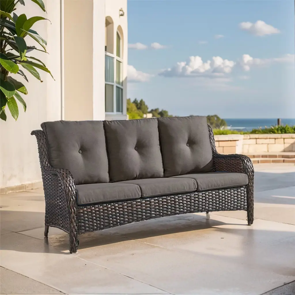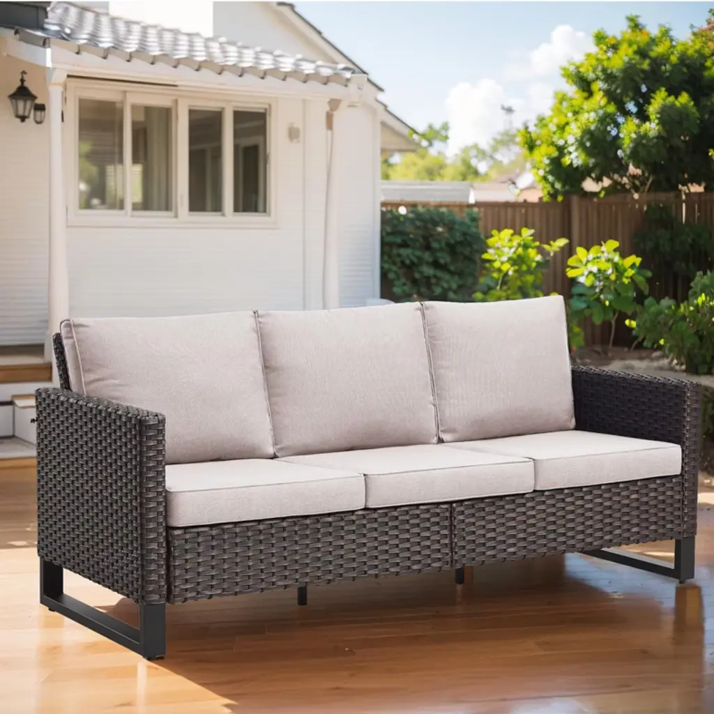 Elevate the beauty and comfort of your outdoor living space with the exquisitely crafted POCASSY Outdoor Patio Woven Brown Rattan Sofa, designed to deliver a luxurious seating experience that seamlessly blends style, durability, and unparalleled relaxation. Featuring plush 3.5-inch thick seat cushions for ultimate comfort and premium hand-woven PE wicker for lasting resilience, this elegant three-seat sofa is the perfect addition to your patio, garden, or poolside, transforming any outdoor area into a sophisticated retreat for relaxation and entertainment.