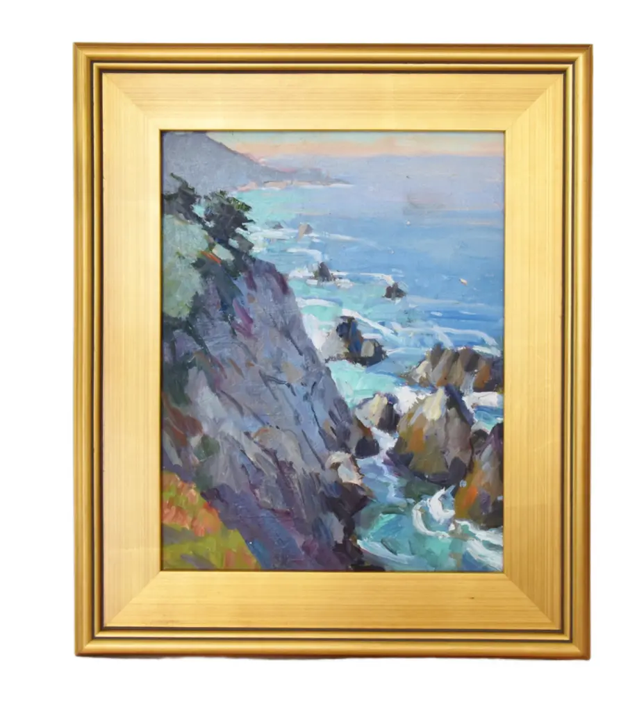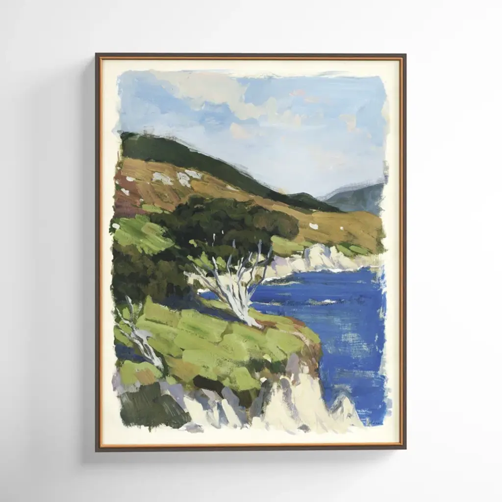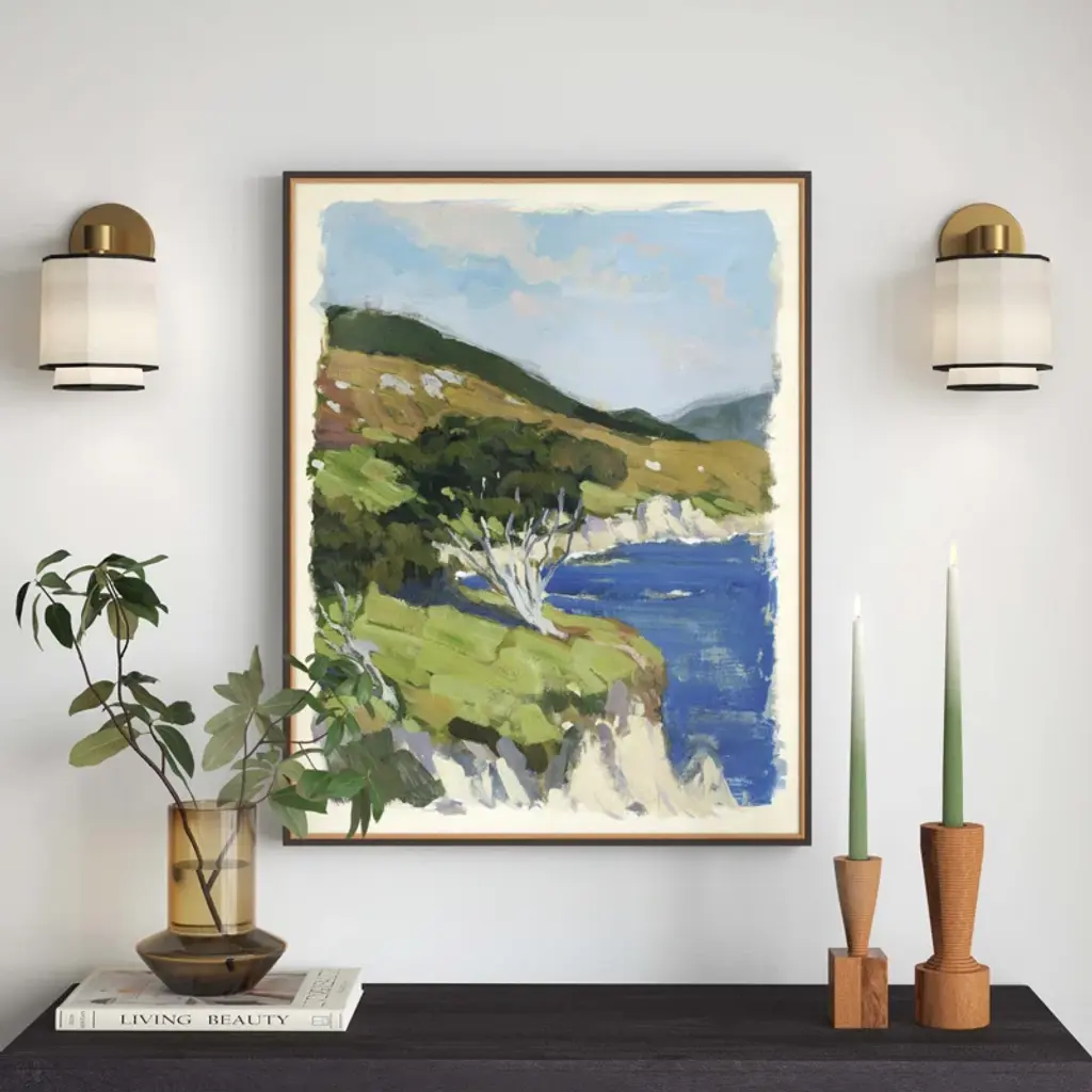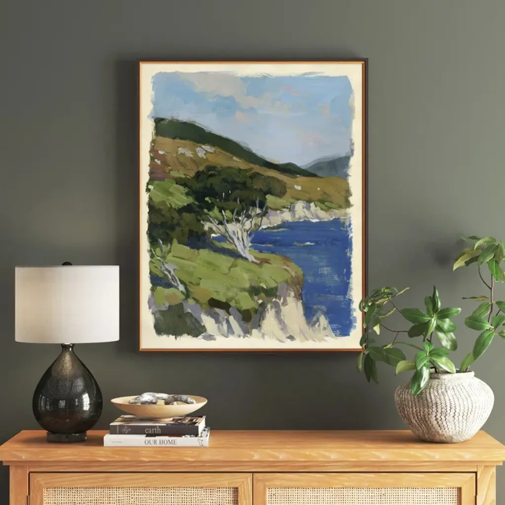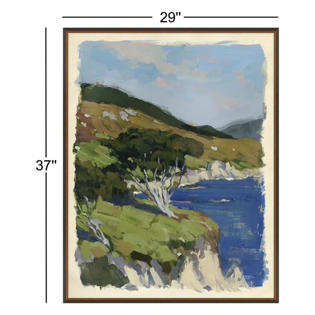 This graphic art print features a loose rendering of the gorgeous Point Lobos State Natural reserve, long considered the "crown jewel" of California's 280 state parks. This USA-made painting print is giclee printed on archival paper for a museum-worthy look you'll love to show off. We love the rich hues of green and blue and the contrast of the grass and trees against the bright sky and dark hues of the coast. This print comes mounted in an artisan handcrafted wood molding, so it's ready to hang as soon as it arrives.