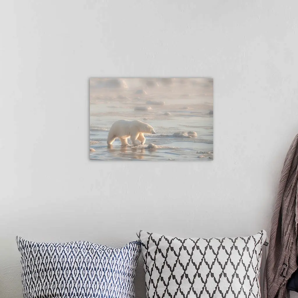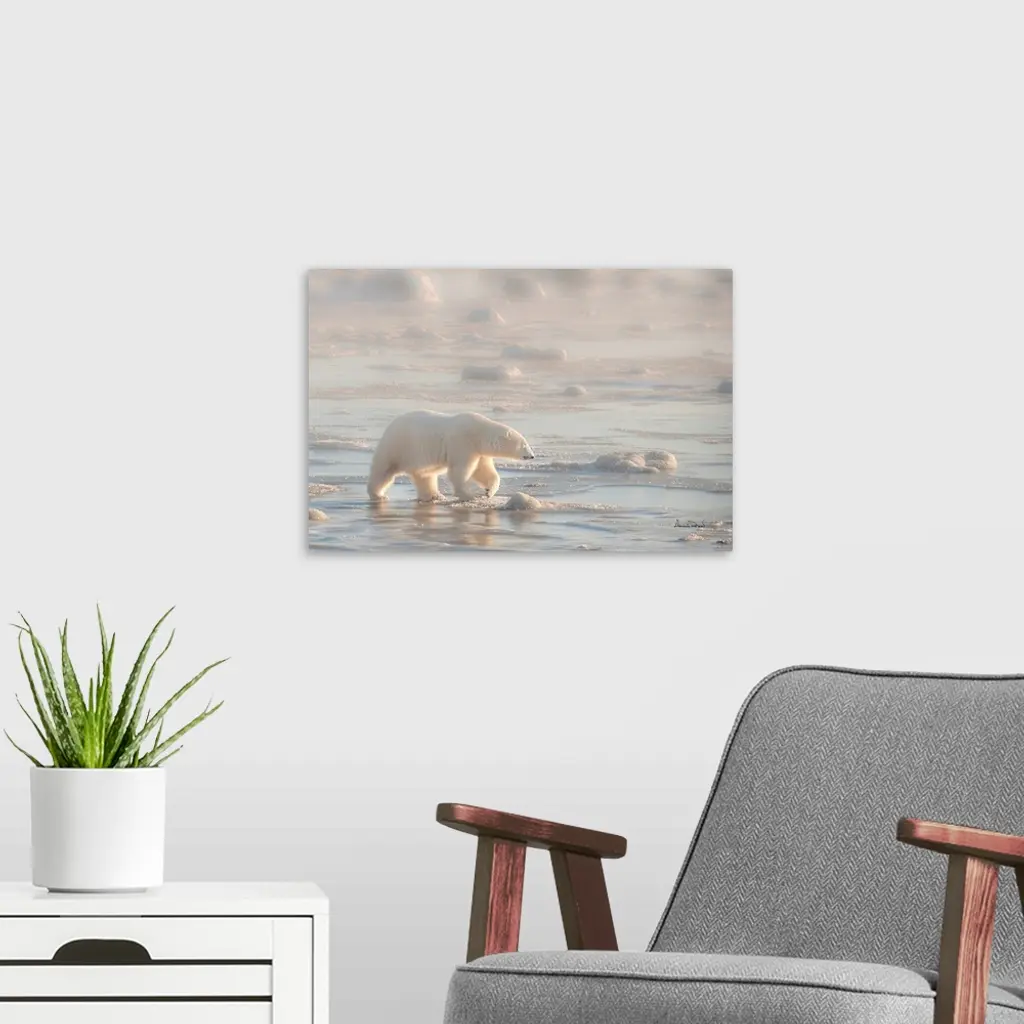 Sleepy polar bear on Hudson Bay Coast, Manitoba, Canada strolling through the fog on the sea ice.