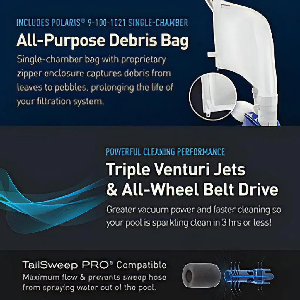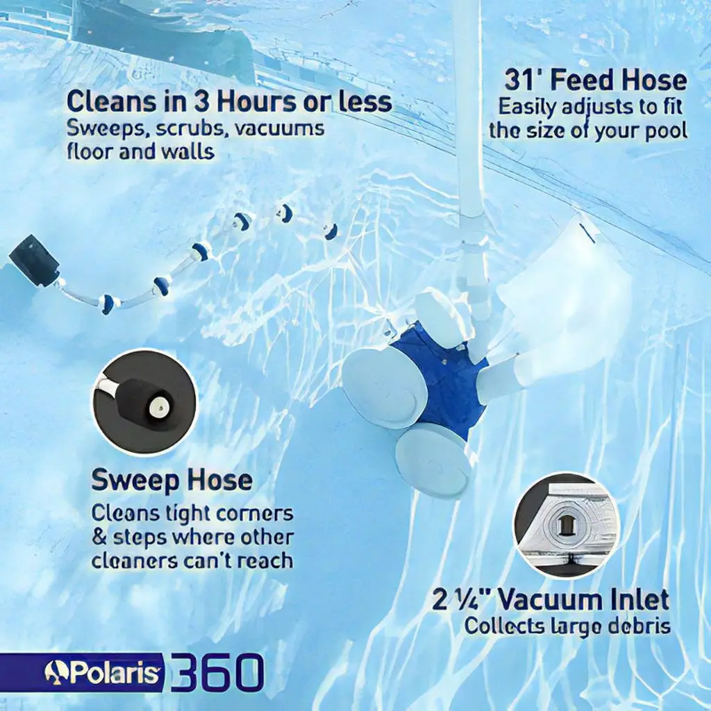 An advanced pressure-side automatic pool cleaner that operates without a separate booster pump. The Polaris 360 easily connects to a dedicated pressure line and is suitable for all in-ground pools. It sweeps, scrubs, and vacuums all surfaces of the pool. It also traps large debris like leaves and pebbles in its own filter bag.The Polaris 360 roams the pool bottom and vacuums the walls spotlessly clean without a booster pump and is Ideal for vinyl, gunite or fiberglass in ground pools of any size or shape. It even works great under your solar blanket. The internal back-up timer automatically frees itself from nooks and crannies, so it keeps cleaning any shape pool without interruption in 3 hours or less. Because it operates on the pool's return line your skimmer stays free to clean surface debris. As the pool cleaner sweeps the pool, it also distributes chemicals and heat throughout the pool for better circulation and chemical effectiveness. Includes a filter bag and 31-foot hose kit. This Polaris Vac-Sweep 360 head and hose pressure side pool cleaner works in all in-ground pools; operates on pool circulation pump. Ready to connect to 1.5-inch dedicated pressure cleaner line.