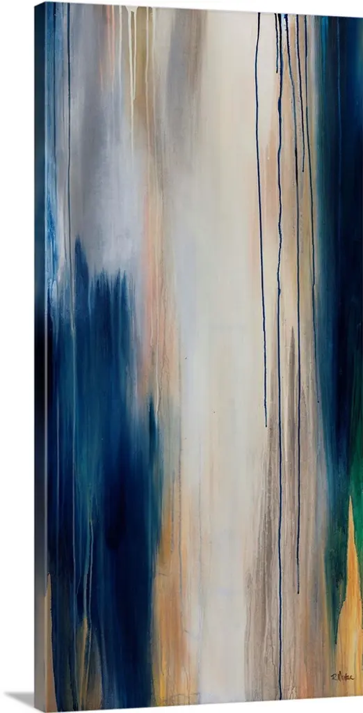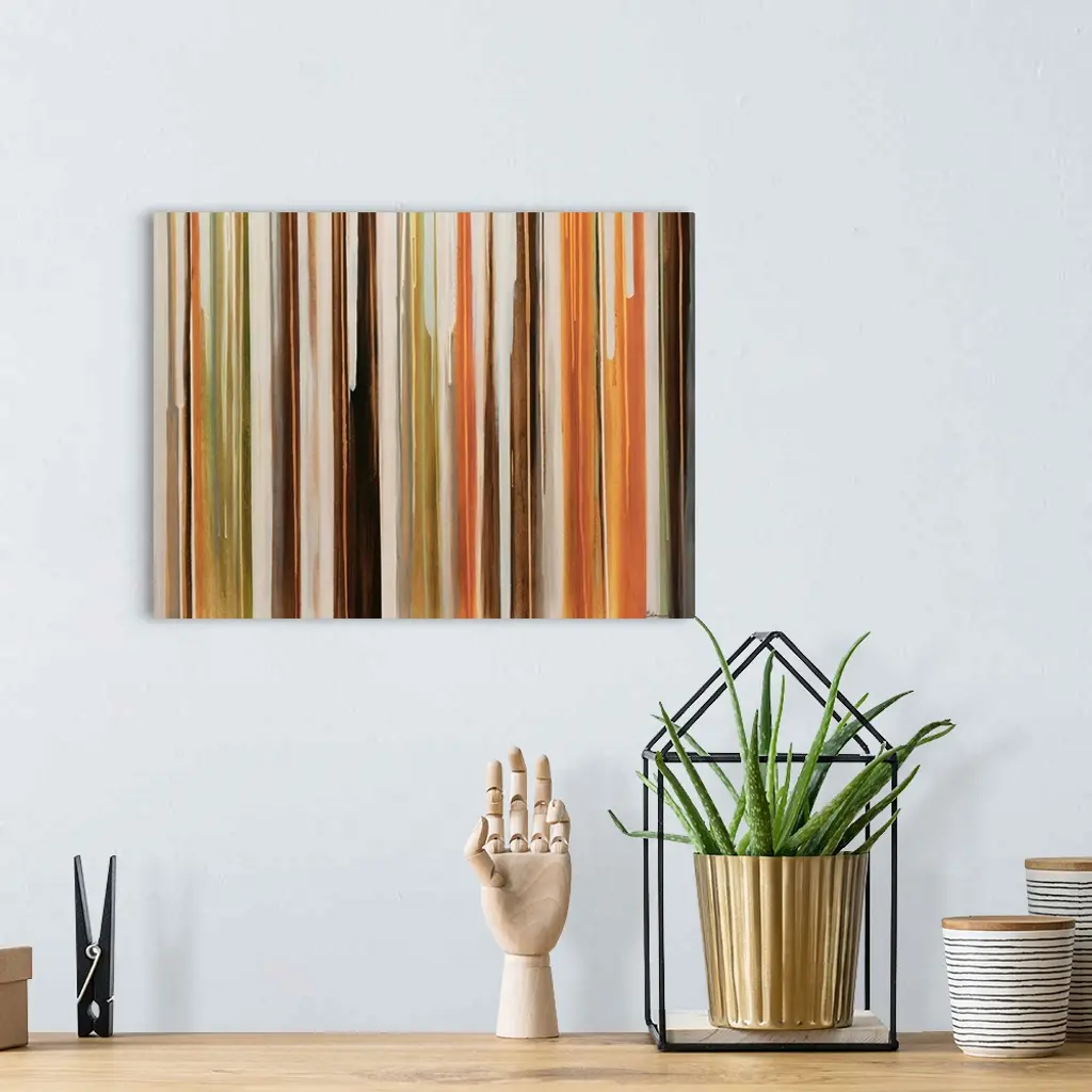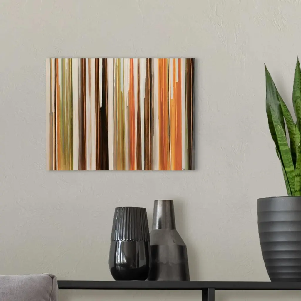 Large abstract art includes an abundance of thin vertical lines in a variety of different earth tones that have been aligned next to each other.