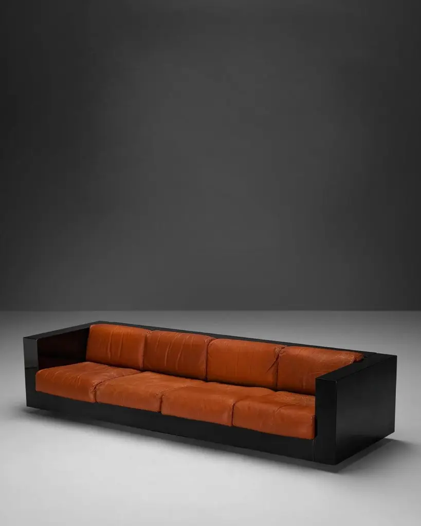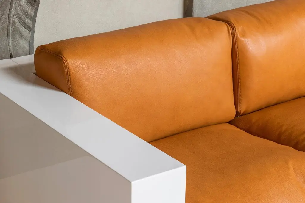 The series is composed of an armchair and sofas with two, three or four seats. The rigid structure, made by assembling four parts of equal thickness, with rounded edges, contains slightly protruding seat cushions. The desired purity of the silhouette is accentuated by the precious finishes: glossy polyester lacquer for the chassis, similar to that of a pianoforte, and the fine leather of the soft cushions, resembling the upholstery in luxury automobiles. The essential form combined with the precision of the design and the refinement of the finishes and details make this project by Lella and Massimo Vignelli timeless, over and above passing fashions, which they always avoided.Available in different otpions:[frame]: white / black[cushions] : classic Saratoga orange or a wide range of colorsDIMENSIONS:150[W] x 90[D] x 60[H] cmAvailable in different options, please inquire with us.