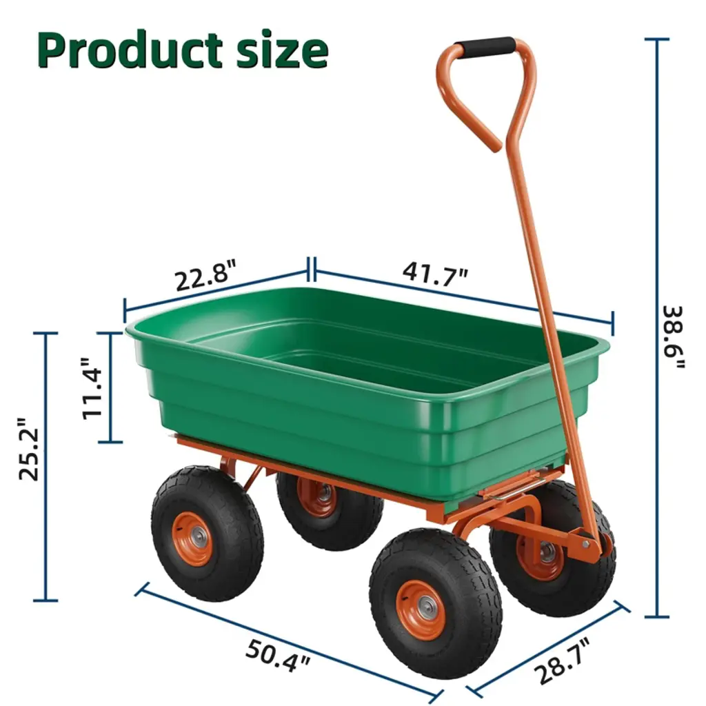 Poly Dump Cart - Heavy Duty 1200lb Garden Wagon, Utility Cart with Quick-Dump & No-Flat Tires for Landscaping, Yard Work?? Heavy-Duty 1200lb Load CapacityBuilt to carry massive loads¡ªup to 1200 lbs! Made with 3mm reinforced polypropylene, this cart offers 4 cubic feet of space, perfect for soil, mulch, rocks, bricks, tools, and outdoor cleanup.? Quick-Release Dumping & Adjustable HandleTilt the front to unload in seconds¡ªno lifting or struggling. The 180¡ã adjustable handle gives you full control forward or backward, making maneuvering effortless in tight spaces.?? All-Terrain 13" Puncture-Proof TiresNever worry about flats again! These 13" tires feature deep treads that roll easily over mud, grass, gravel, and slopes. A strong steel axle adds stability and support for heavy loads.??? Weather & UV ResistantDesigned to last season after season. The anti-corrosion coated frame and UV-treated poly body resist rust and sun damage, keeping your cart looking and working like new.??? Multi-Use Organizer with DividersCustomize your load with removable dividers. Turn the cart into a tool hauler or keep items separated. Plus, it¡¯s compatible with ATV and lawn tractor tow hitches!?? Product Details Dimensions: 41.7¡± D x 28.7¡± W x 38.6¡± H Capacity: 1200 lbs Volume: 4 cu. ft Tires: 13¡± x 4¡± puncture-proof Handle: 180¡ã adjustable Frame: Steel with anti-corrosion coating Body: 3mm UV-stabilized polypropylene Perfect for gardening, landscaping, farm chores, construction sites, and backyard cleanups. The Poly Dump Cart is your go-to helper for all heavy-duty outdoor tasks!
