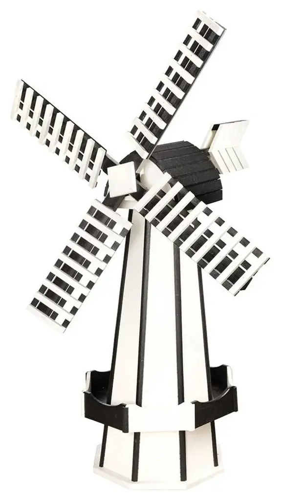 Amish Handcrafted41" POLY DUTCH WINDMILLWith Working Propeller & Weather VaneWHITE & BLACK - New York YankeesThis 41-inch Poly windmill is meticulously handcrafted to stand the test time while providing a beautiful eye-catching enhancement to your lawn or garden. The working propeller and rotating weathervane top provide spirited movement and life to your area with even gentle breezes. Open interior space provides an aesthetic way to conceal an object.Handcrafted from high density poly plastic to stand the test of time and use. Poly lumber is eco-friendly being made from recycled milk jugs and resists splintering and rotting. No need for chemical weatherproofing treatments. It is also impervious to normal wood-destroying pests. Poly is then treated with UV protection, so it will retain its bright and vibrant colors season after season.Measures: 41" top of propeller/ 31" top of tower / 15" diam at baseInterior Space: 14.25"h x 8"wWorking, wind-spun propellerRotating, weather vane TopMaintenance-free high-density recycled polyAmish Handmade in Lancaster, Pennsylvania USAAMISH HANDMADE in the USAPLEASE NOTE: Each is individually handmade-to-order by Amish craftsmen guaranteeing you a unique, true one-of-a-kind piece.