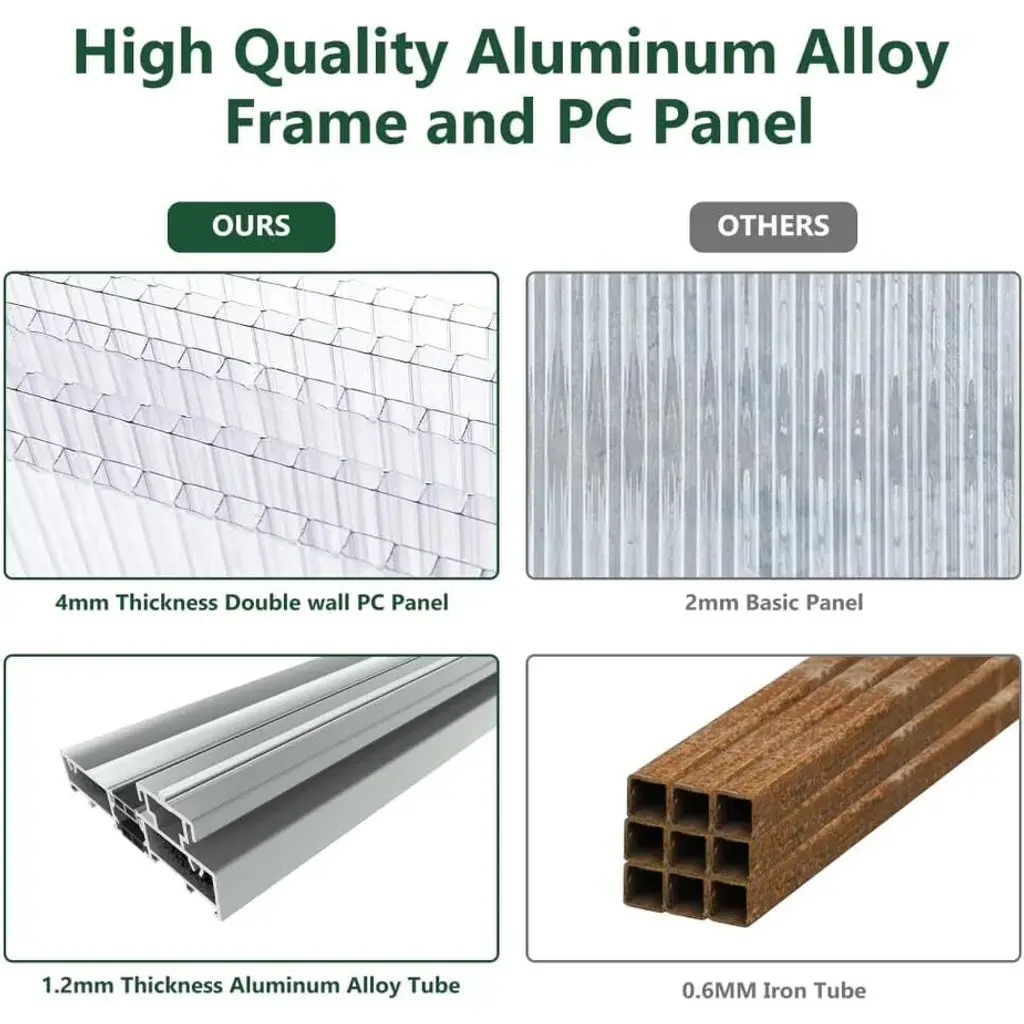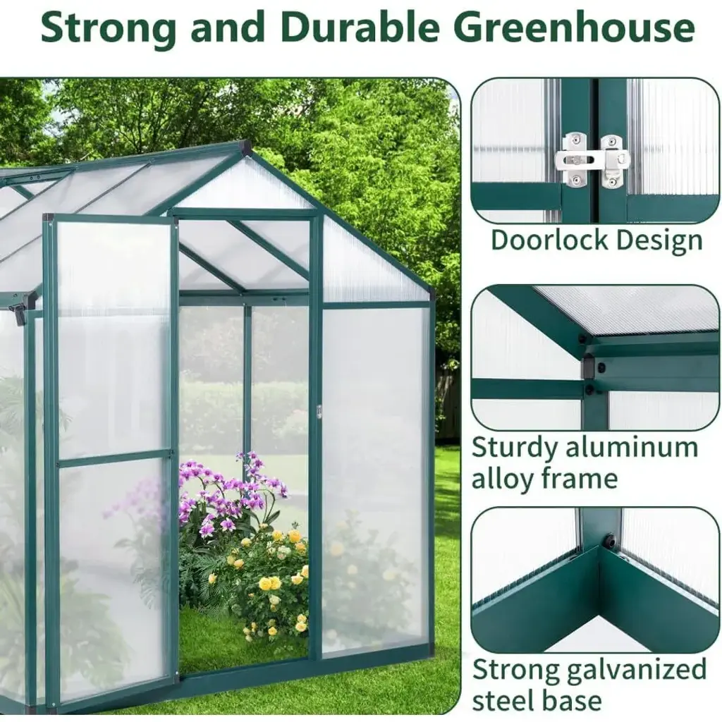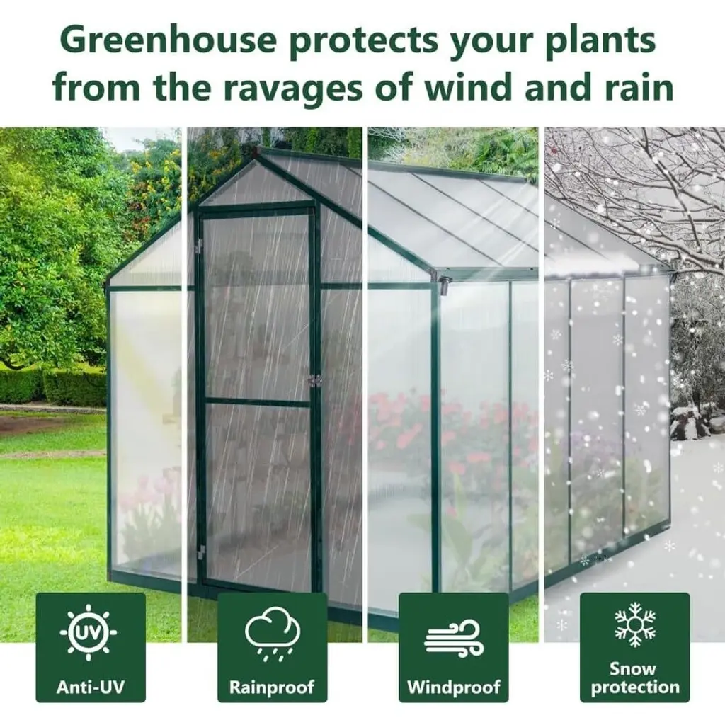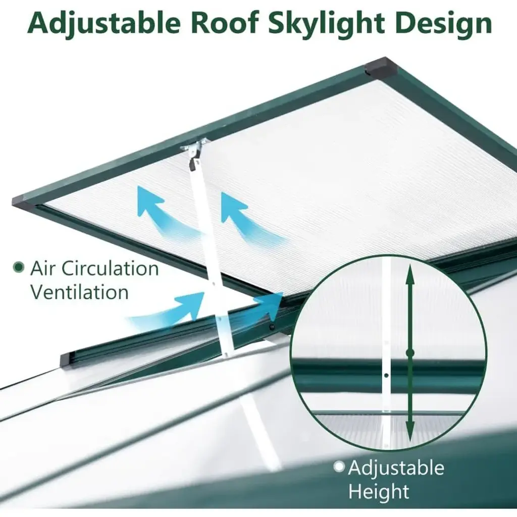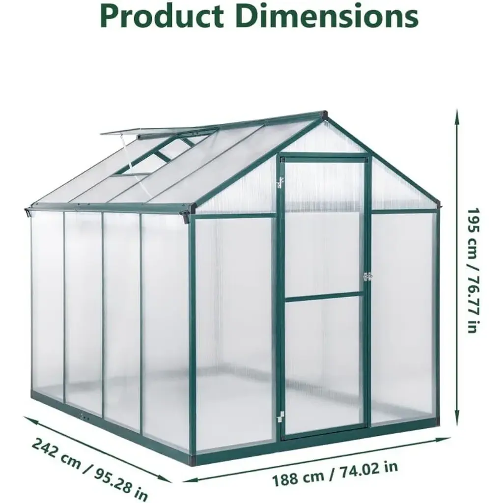 Walk-in Spacious Greenhouse: This greenhouse offers a generous growing environment, providing ample space for you to plant a variety of plants and flowers. The flexibility in arrangement allows you to effectively customize the interior layout to best suit your gardening needs. Convenient Sliding Door: The sliding door design facilitates easy access in and out of the greenhouse, making your gardening tasks more convenient. Additionally, it helps protect your plants from animals and pets, ensuring a safer growing environment. Detailed instructions and all necessary tools are included for straightforward assembly. Durable Heavy-Duty Frame: Constructed with 4mm thick polycarbonate boards, this greenhouse can withstand outdoor temperatures ranging from -20℃ to 70℃. The panels allow sufficient sunlight to penetrate while effectively blocking most UV rays, creating a safe and conducive environment for plant growth. Efficient Drainage System: Featuring a built-in drainage gutter system, this greenhouse effectively channels water away from the structure. The sloped roof design prevents water accumulation, while the heavy-duty rust-proof aluminum frame and thickened corner column piles ensure a stable connection to the soil for enhanced durability. Adjustable Roof for Ventilation: The adjustable roof allows for easy access for beneficial insects, aiding in pollination and seed sowing. This feature promotes excellent ventilation within the greenhouse, consistently providing fresh air for your plants and contributing to a healthy growing environment.