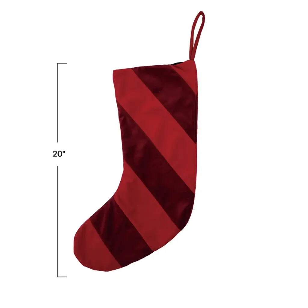 Add a touch of sophistication to winter or Christmas decor with this luxurious Fabric Velvet Striped Stocking. Featuring elegant red stripes, this stocking is crafted from high-quality polyester and adds a touch of refinement to any holiday display. Perfect for hanging on mantels, shelves, or as a festive accent, it measures 20 inches in height, bringing a touch of elegance to the holiday season.