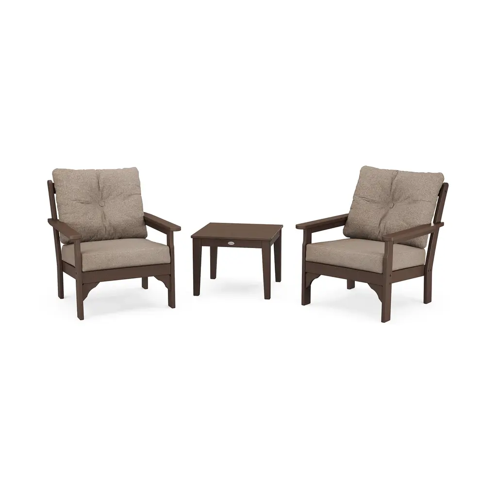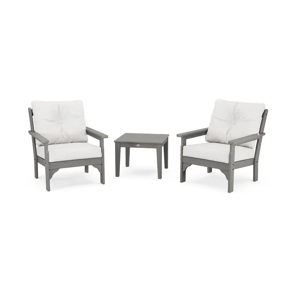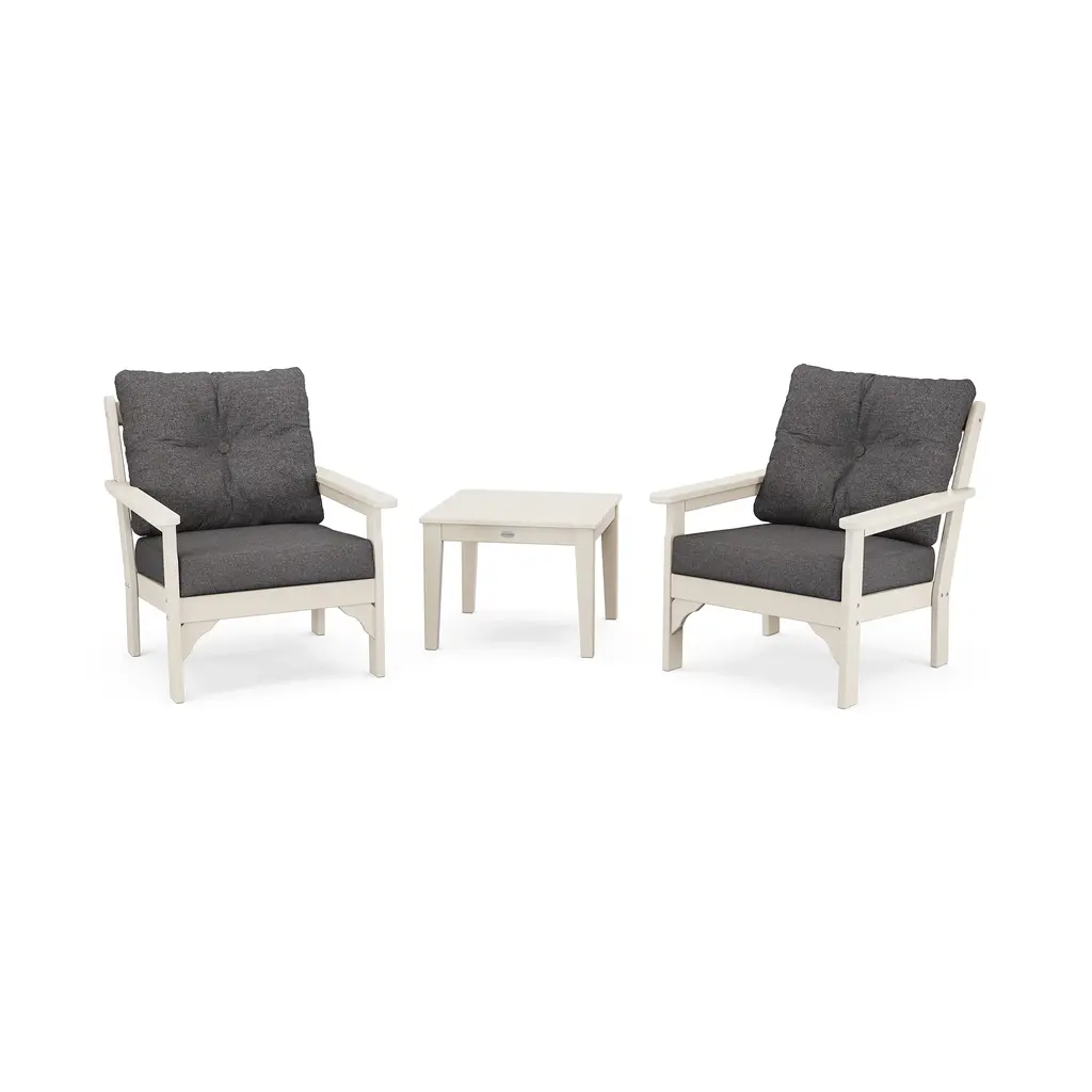 Transform any outdoor space into a cozy escape with our Vineyard 3-Piece Deep Seating Set. Plush deep seating cushions sit atop ergonomically inclined genuine POLYWOOD® lumber frames. This durable and innovative construction provides a low-maintenance design while checking off all boxes for premium outdoor style. This outdoor furniture set is made in the USA and features a fade-resistant, mildew-resistant and all-weather design. Say goodbye to high-maintenance patio furniture and say hello to the best in outdoor luxury with Vineyard Deep Seating for your porch, deck or backyard patio.