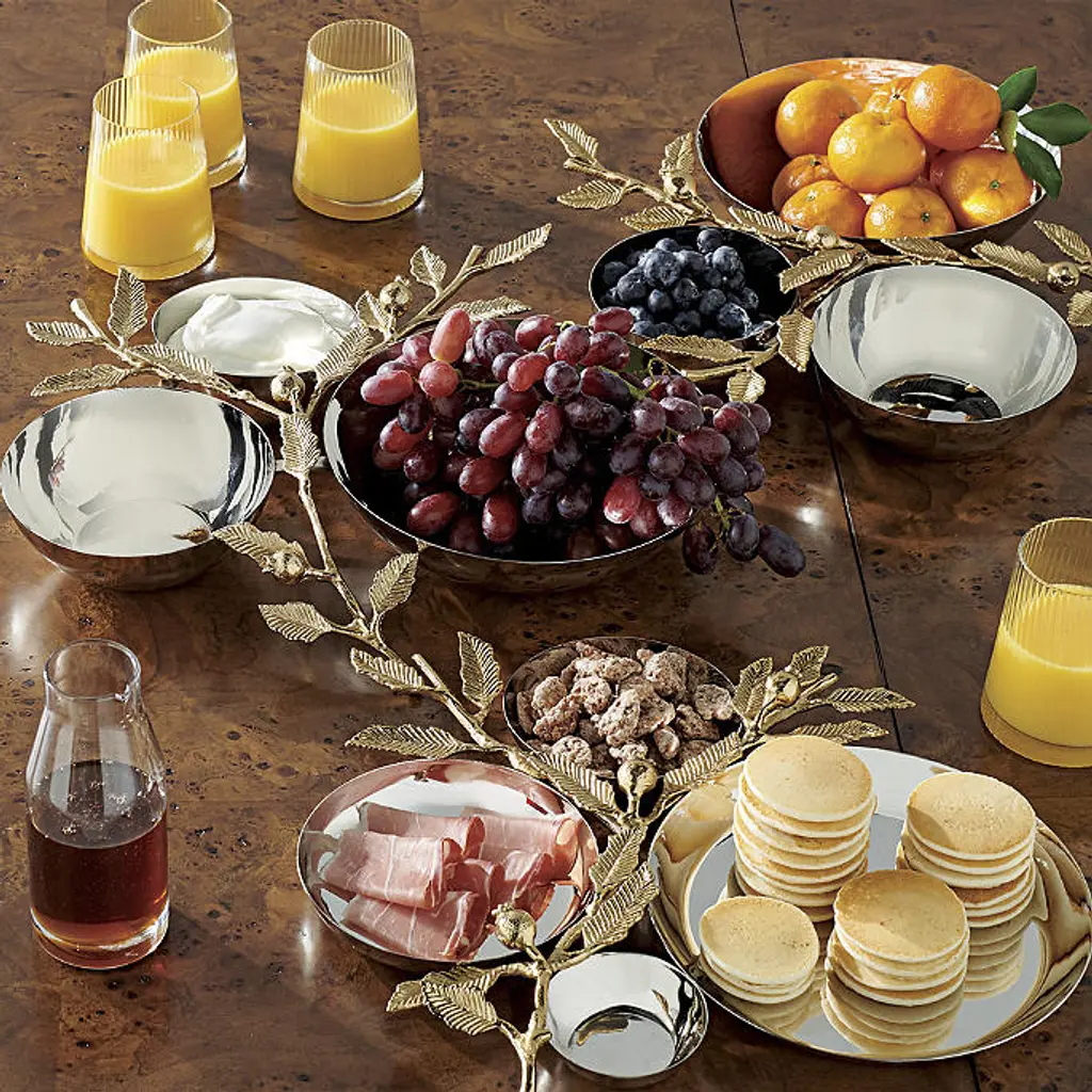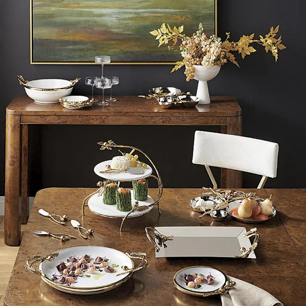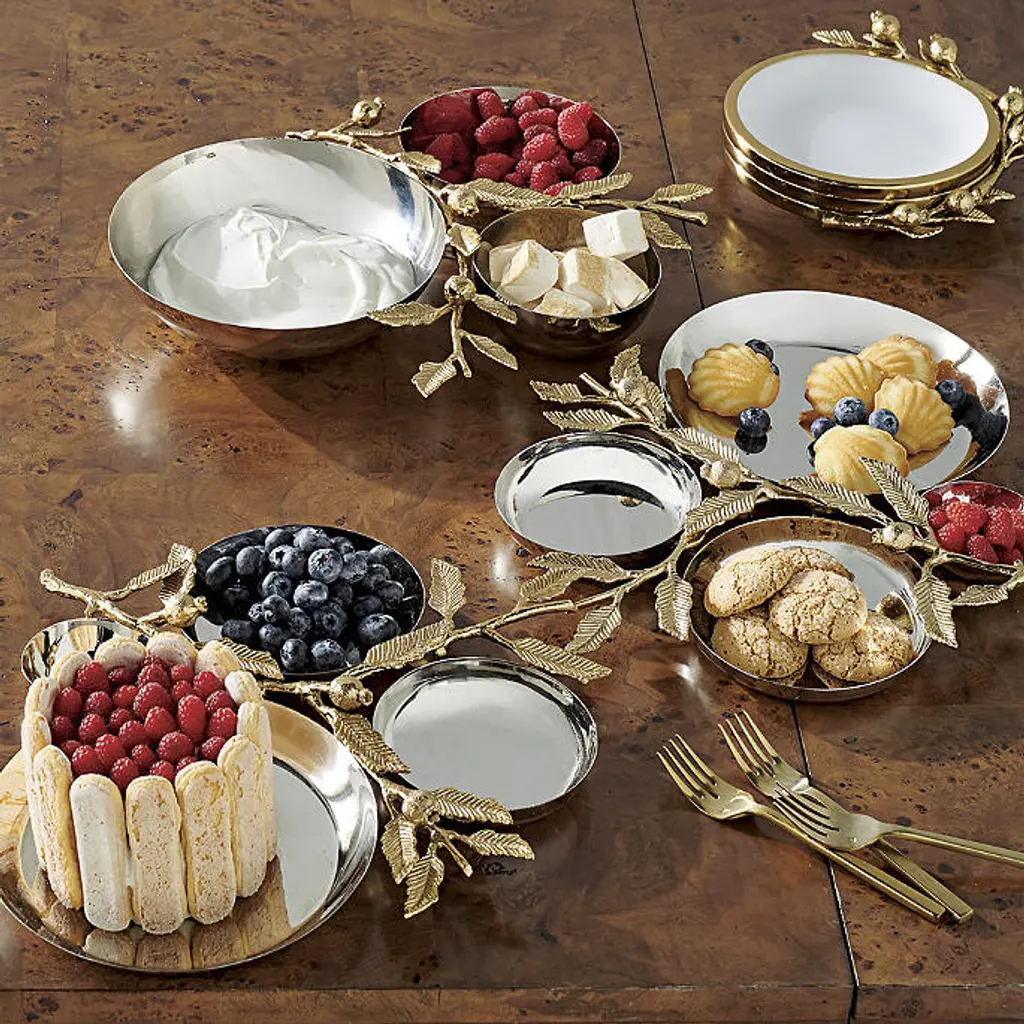 The sophisticated pomegranate-leaf design is cast in gold finish, providing elegant serveware to enhance any dinner party. Constructed of steel and brass, these pieces provide reliable service for guests of any event. Crafted of steel and brass Sand-casted design Silver and Gold finish: Cheese Knives, Metal Serving Platter, Three-Cluster Ultimate Server and Four-Cluster Ultimate Server White and Gold finish: Appetizer Plates, Ceramic Serving Platter, Two-Tier Server and Serving Bowl Hand wash and wipe dry with soft, dry cloth A Frontgate exclusive. At Frontgate, our primary focus is quality. We guarantee that every product we sell will stand up to the supreme test – our customers' satisfaction. To learn more about our policies, visit our Shipping & Processing, Returns & Exchanges and Warranty & Price Guarantee pages.