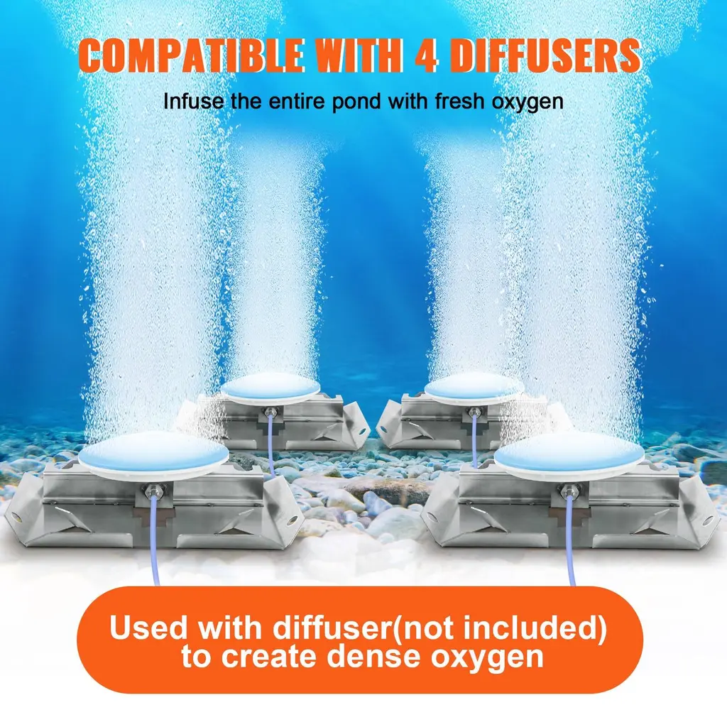 Let Your Pond Breathe: Are you suffering from pond and lake problems related to excessive algae growth, fish dying, and muck accumulation? Well, say goodbye to those troubles of the past! Our pond aerator is designed to reduce pond muck, improve water quality, boost dissolved oxygen, and protect fish. It will help you restore lakes and ponds naturally. Get ready to rejuvenate your pond and lake! Powerful and Quiet Operation: Power: 550W; Horsepower:3/4 HP; Max. CFM: 5.2. Our pond aeration system features an efficient oil-free air compressor, aerating ponds up to 3 acres, 50 ft deep. Your ponds are about to look brand new this year! The rubber compressor mounts reduce noise and vibration for a 65dB silent continuous and low noise operation. There is no need to worry about working efficiency either. High-quality & Convenient Timer: Are you worried about having to stare at your pond all day? Go ahead and enjoy the things you want to do! The pond aerator kit is equipped with a timer to allow you to set the opening and closing time independently, saving energy and consumption. You can regularly adjust the working time of the aeration system according to weather conditions, ensuring enough oxygen and protecting the motor. Amazing Accessories: This lake aerator comes with an air compressor, a timer outlet, and all necessary fittings. The valves, including the pressure relief valve, check valve, and electromagnetic valve, are all designed for security use and prolong the motor's working life. Get ready to fall in love with your pond again! Hassle-free Installation:The installation can't be easier, thanks to the clear user manual. Our pond aerator system is durable, reliable, and low maintenance. It is suggested to put the compressor in a ventilated place and sheltered from rain and sunshine. These precautions will lead to less dust and prolong the life of your machine. Package Content 1 x Air Compressor 1 x Timer 1 x User Manual