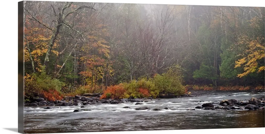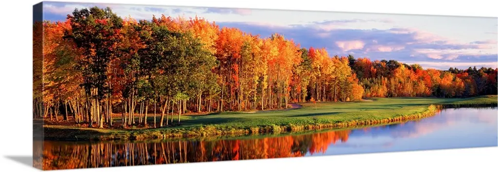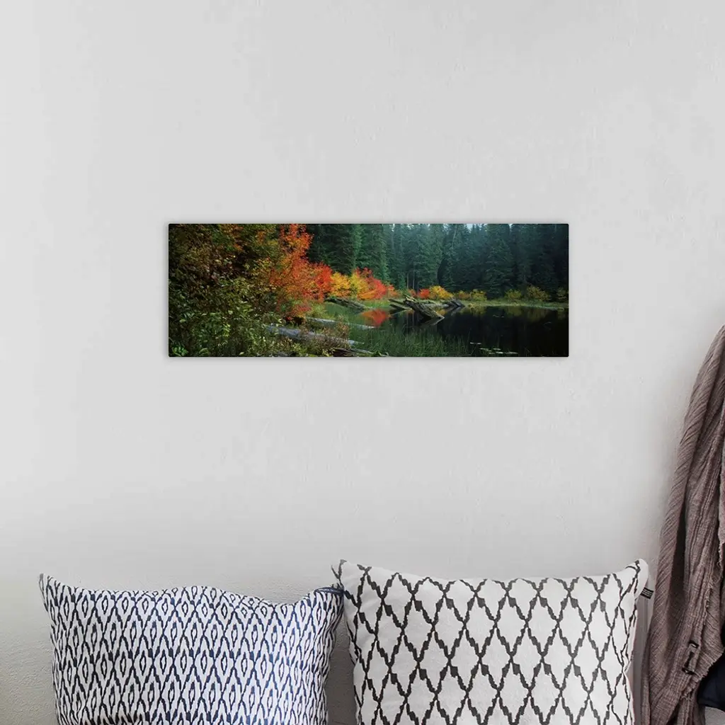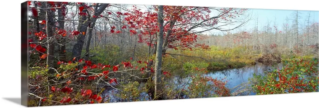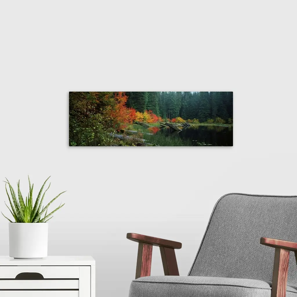 Landscape photograph on a big wall hanging of a pond with large logs protruding from the water, surrounded by a forest of green pines and vibrant fall foliage.