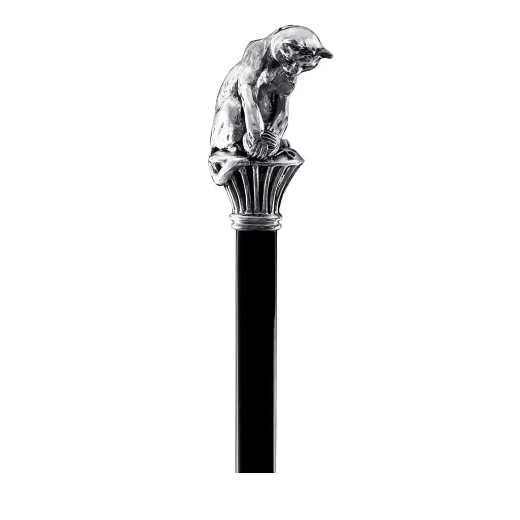Characterized by an elegant and classic design, this stick features a metal handle richly decorated with elegant patterns embossed on the surface. The conical shaft of this sophisticated accessory is crafted in gloss black beech wood and has a silver-plated brass tip with protective rubber end. This is a collectible item, not to be used for walking.