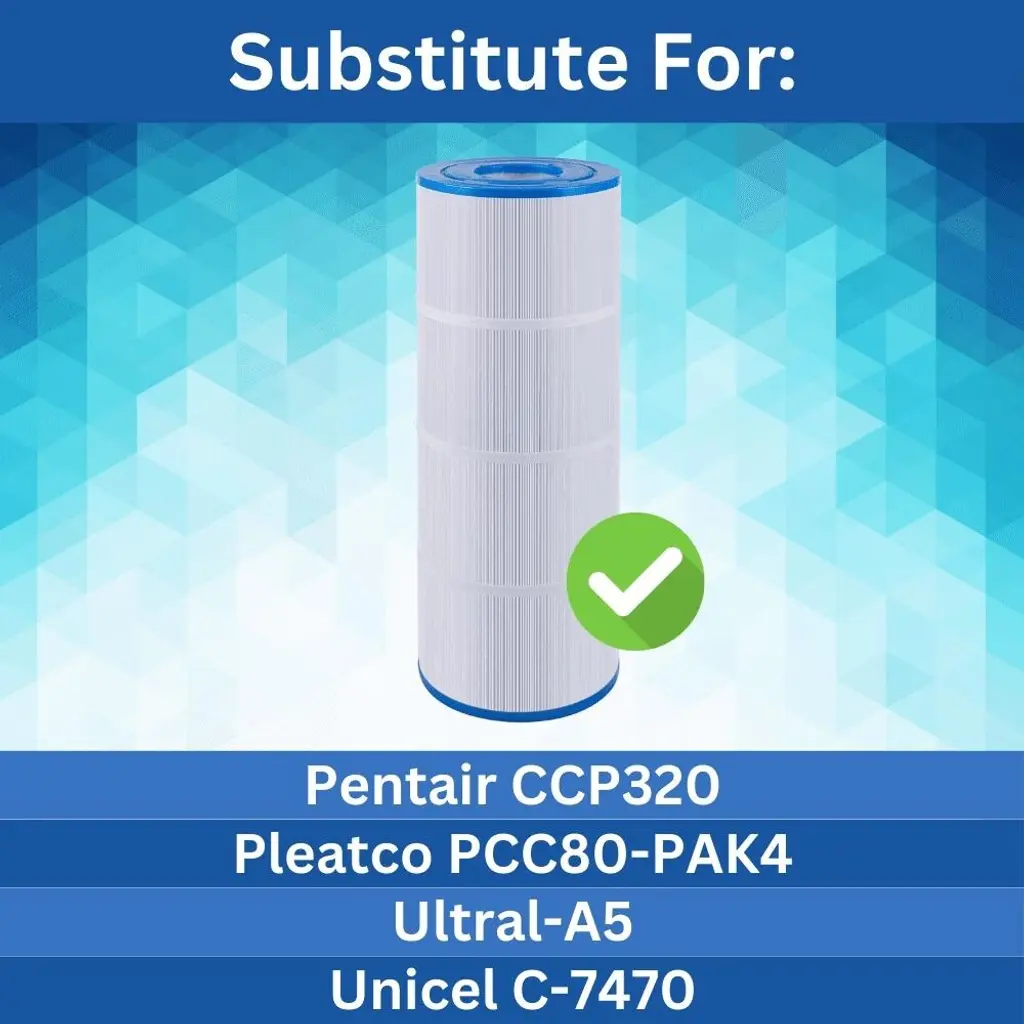REPLACEMENT/SUBSTITUTE FILTER - Achieve purer, cleaner water like you've never seen before, in your pool or spa using our replacement cartridge filters. Our filters are a compatible substitute for the following Pentair CCP320, Pleatco PCC80-PAK4, Ultral-A5, Unicel C-7470, R173573, Filbur FC-1976, 178580, 817-0081, Clean and Clear Plus 320 ★PSA: This filter by G-NEUS is a compatible replacement/substitute part and the manufacturers' names and part numbers have been used for reference purposes only REPLACEMENT FILTER SPECS - Provides 80 Square Feet of media coverage (x4 cartridges). Diameter: 7"; Length: 20 1/16"; Top: Open Hole: 3"; Bottom: Open Hole: 3" DESIGNED FOR PERFORMANCE AND LONGEVITY: G-NEUS Products are engineered for longevity and easy maintenance, ensuring your pool and spa remain crystal clear and safe for your family