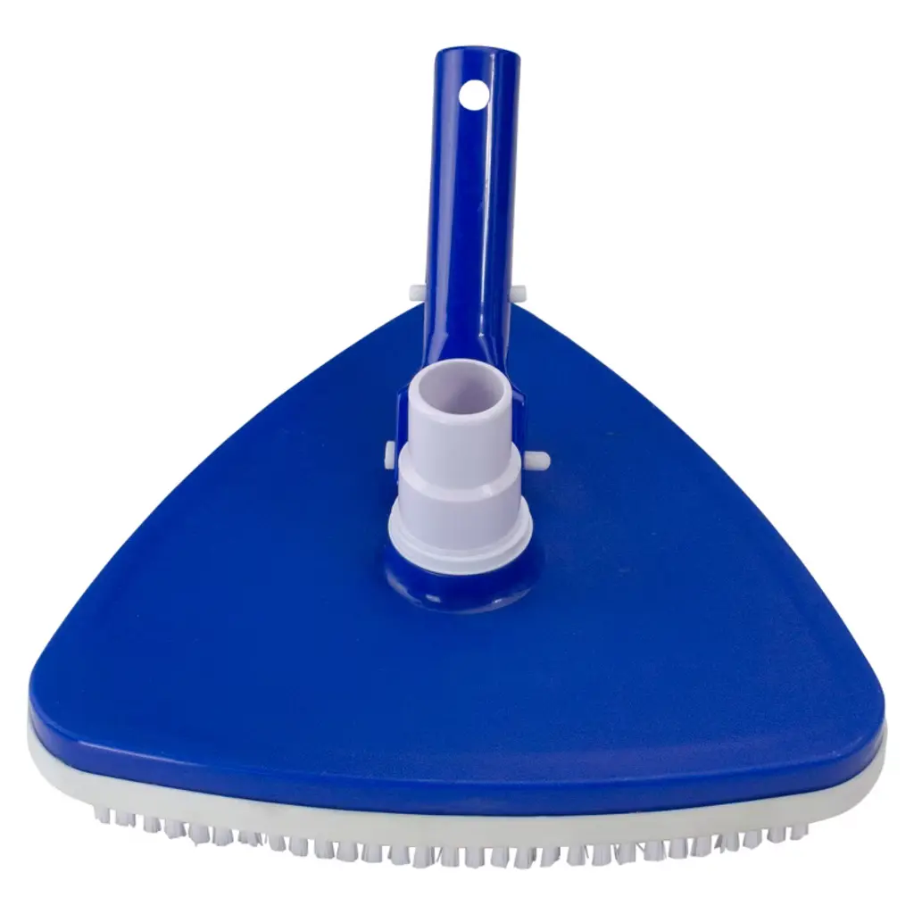 Triangular swimming pool vacuum features state of the art performance. This can be easily used to remove algae from the bottom floor and wall of the swimming pool. Durable and efficient pool vacuum cleaning system. Features: Features blue triangular swivel vacuum head Heavy-duty molded plastic design Push button telepole connector Easy to assemble Ease-adapt handle fits standard 1.25" poles Vacuum dimensions: 4.5"H x 10.5"W x 10"D Material(s): plastic Note: vacuum head only - pole and hose are not included