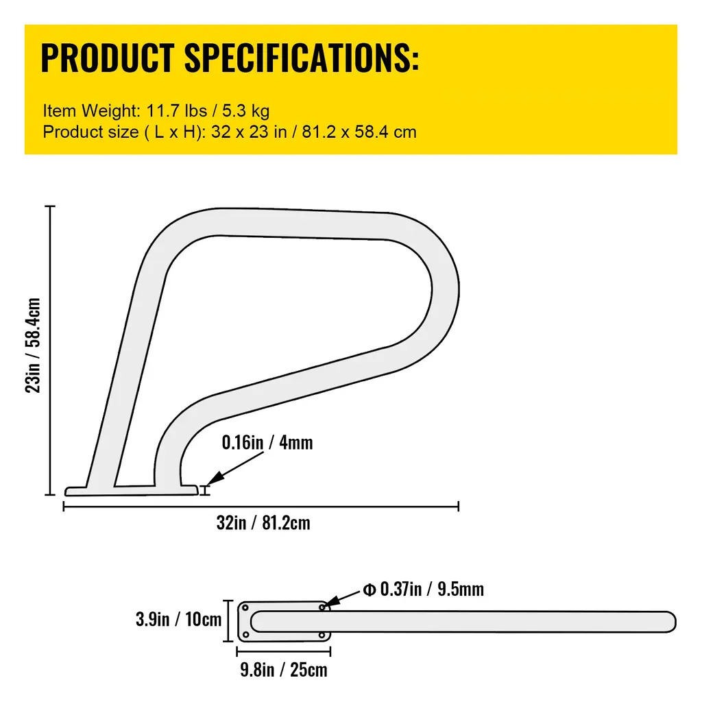 4 FT Nylon Grip Cover: 32"L x 23"H (81.2 x 58.4 cm) / 30"L x 22"H (76.2 x 55.8 cm) pool handrail is designed specifically for providing your family with and secure way to enter and exit the pool. A 4ft comfortable nylon covers the ergonomic curve grip and features excellent performance at preventing your hands from being hurt by cold or hot weather, reducing the risk of slipping even when hands are wet. The grip cover is also detachable for temporary installation. Stainless Steel & Stable Base: Our swimming pool handrail adopts 304 stainless steel with Φ1.9"/ 4.9 cm and 0.08"/ 2 mm thickness tube, demonstrating excellent performance against rust and wear; ensures long-term use. The design of 9.8"L x 3.9"W/ 25 x 10.2 cm built-in base plate and strong welding between handrail body and base plate, holding up to 250 lbs/ 115 kg loading capacity, making your installation and removal process more convenient. Easy to Assemble: The pool handrail has a base plate that can be installed on concrete floors, wood floors, or brick floors. It stands firmly. It is effortless to assemble by one person in a few minutes. Firstly, you should measure the distance from the tile on the inside of the pool as needed, then mark and drill the four φ0.4"/ 9.5 mm pre-drilled holes; use the included screws and anchors to tighten. Complete Accessory: The swimming pool stair rail is equipped with useful accessories, so you spend less time and money on hardware: 1 x hammer drill, 1 x wrench, 8 x anchors (insert firstly during concrete ground installation), 8 x self-screws, 2 x nut covers (used on the head of self-screws for rust-protection and decoration). Wide Application: Appropriate for indoors and outdoors home and commercial use. This practical pool grab rail is compatible with swimming pools, sloped entry pools, spas, water parks, etc. It is perfect for assisting children, seniors, and disabled people when entering or leaving the pool. Package Content 1 x Pool Rail 1 x 4ft Grip Cover 4 x Anchors 4 x Nut Covers 1 x M8 Drill Bit 4 x M8*60 Self-tapping Screws