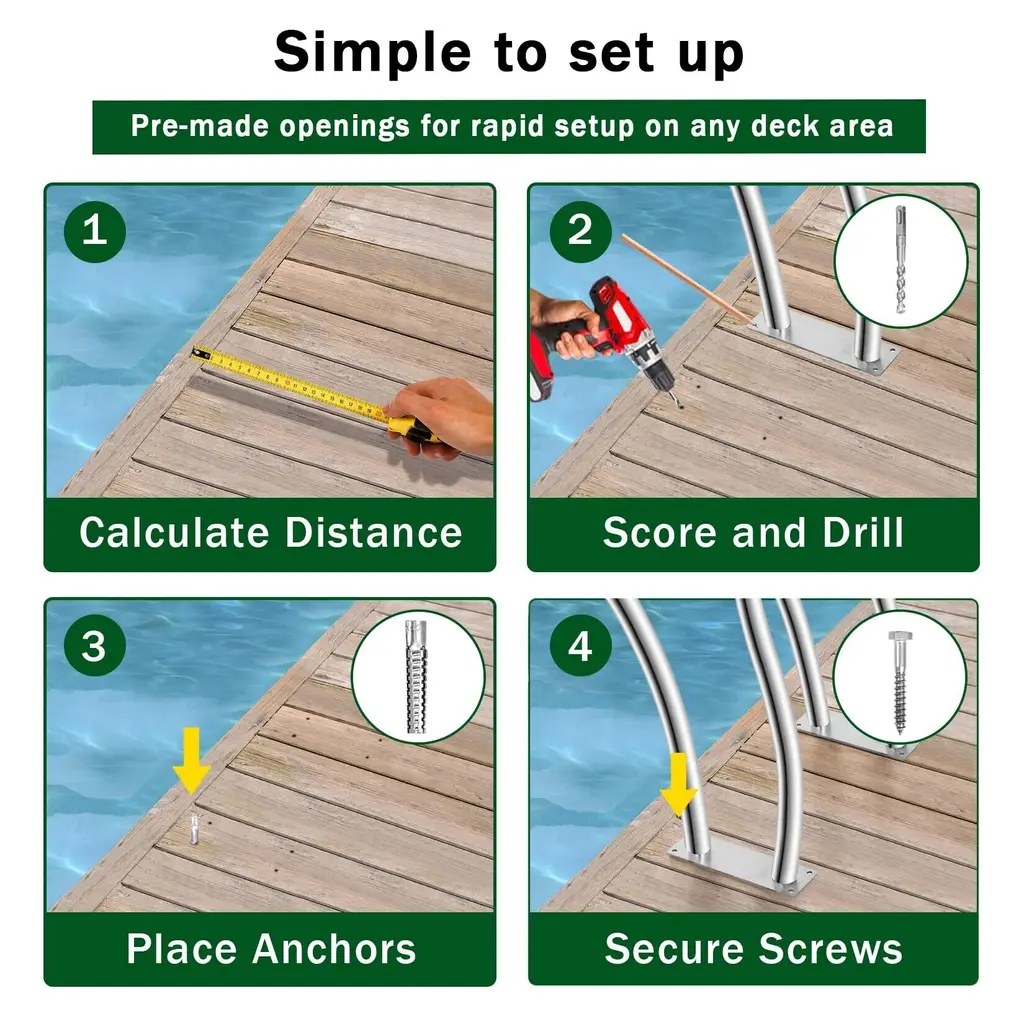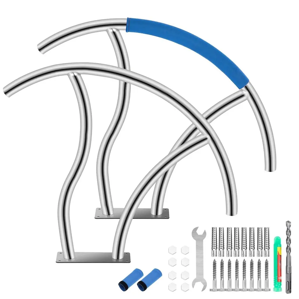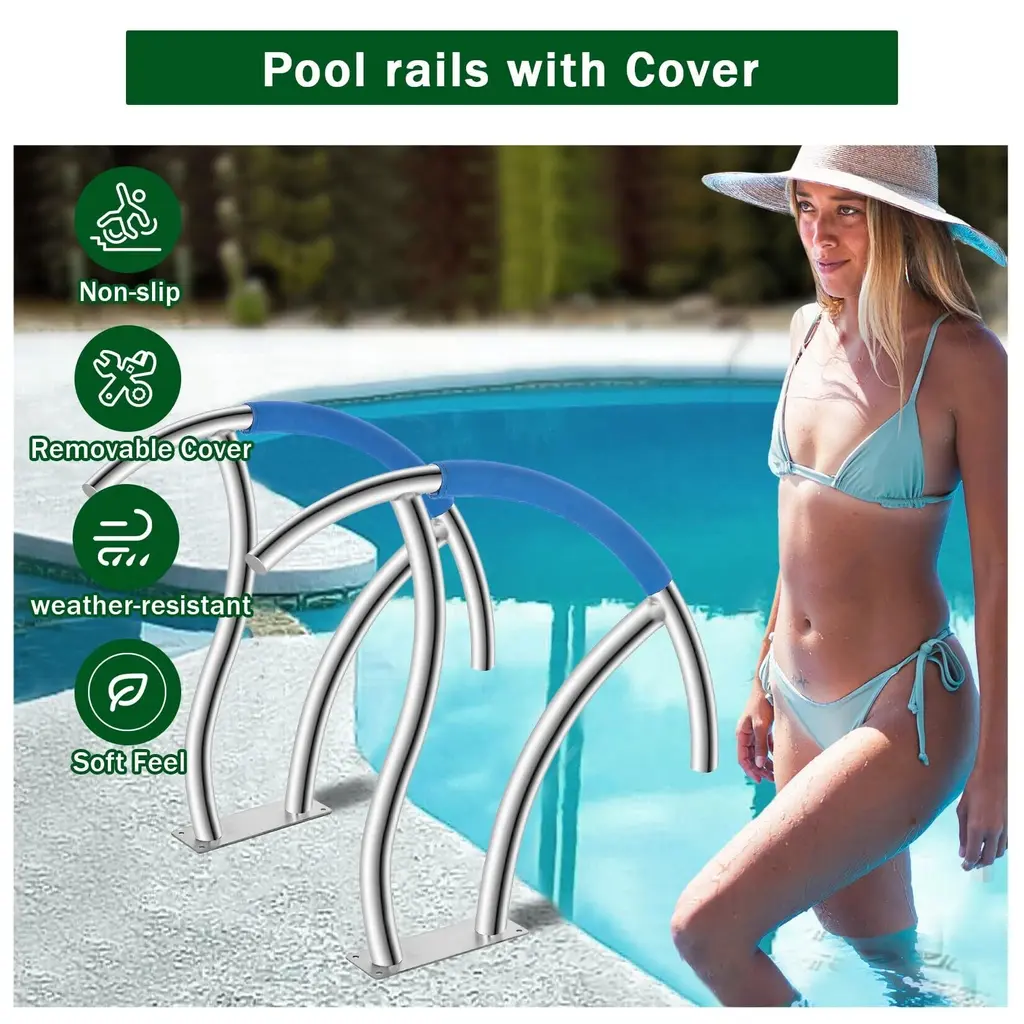 Comfortable and Secure Design: This pool handrail is equipped with a 15.75-inch detachable nylon grip handle cover, and the handle's curved shape adheres to ergonomic principles, effectively shielding hands from extreme temperatures and ensuring safety and comfort for users in wet conditions. 304 Stainless Steel Construction: The swimming pool handrail is composed of 304 stainless steel, boasting resistance to rust, wear, and deformation. The base plate of the railing measures 12 inches in length and 4 inches in width, providing excellent stability and capable of supporting a weight of up to 375 pounds, guaranteeing solid support for users entering and exiting the pool. Simple Assembly: The body of the pool safety handrails is securely welded to the base plate to ensure reliability. This inground pool handrail can be installed on wooden surfaces, gravel, and concrete, and comes with screws and anchors for straightforward installation without the need for specialized tools. Comprehensive Accessories: This pool handle for inground pool access measures 30 inches in length and 30 inches in height, with a set of 2 pieces, and the railing's steel pipe diameter is 1.9 inches. The product package includes 1 hammer drill, 1 wrench, 8 anchors, 8 self-tapping screws, and 8 nut caps, providing customers with a complete solution that saves time and costs during installation. Versatile Use: This pool railing for inground pools is appropriate for both residential and commercial applications, suitable for indoor and outdoor environments such as swimming pools, sloped entries, spas, water parks, and other venues. It offers support for safe entry and exit from pools for all demographics, featuring diverse functions and a broad range of applications.