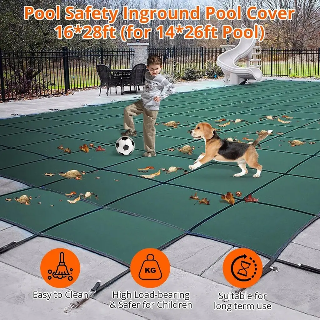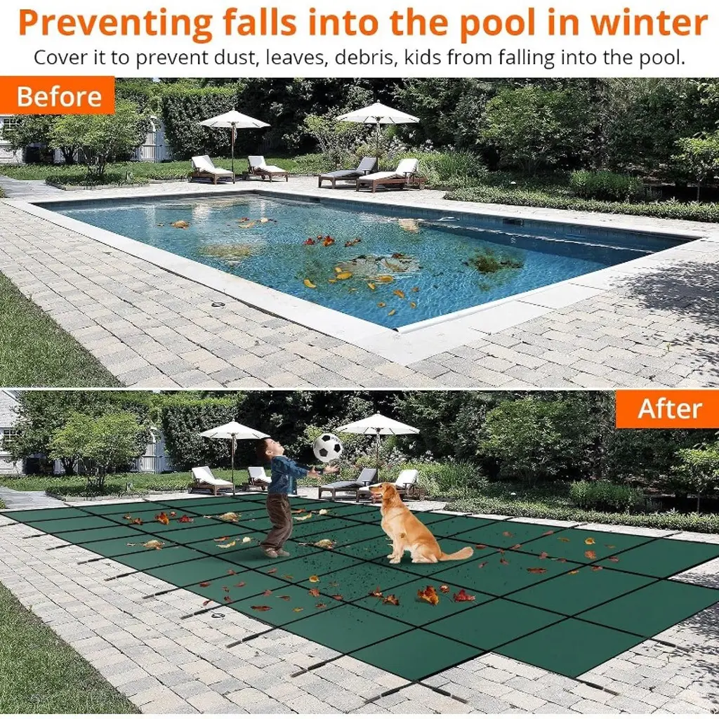 Protect your pool and loved ones with this premium safety inground pool cover. Designed to fit 16x32ft pools with center steps, this 18x34ft cover provides full overlap protection. Made from ultra-dense polypropylene (PP) mesh, it prevents debris from entering the pool while allowing water drainage. The set includes a pool safety net, stainless steel hardware, and complete installation tools for secure and easy setup. Ideal for seasonal pool protection and peace of mind.