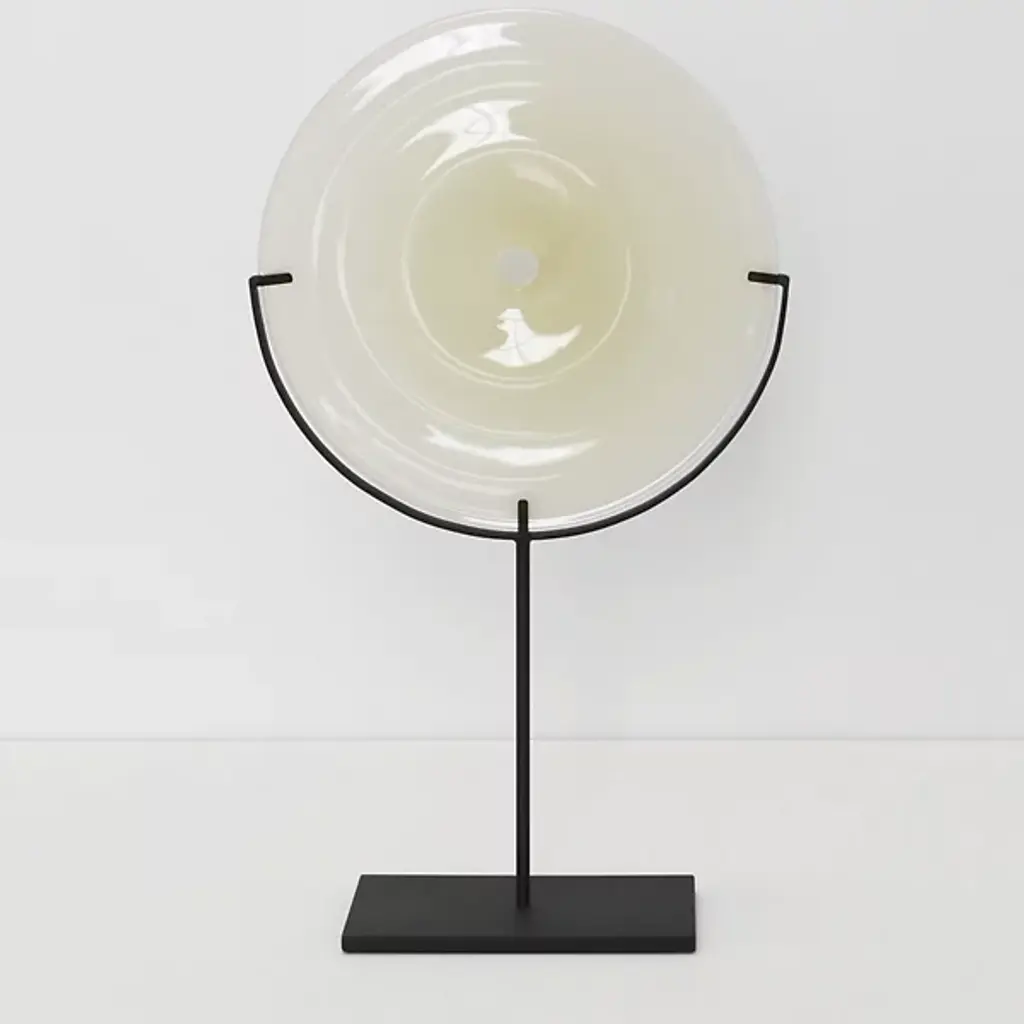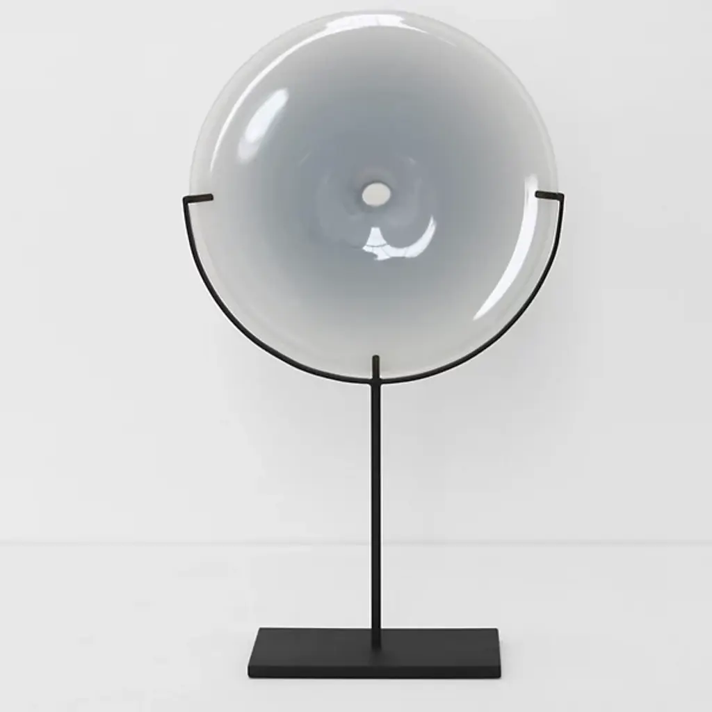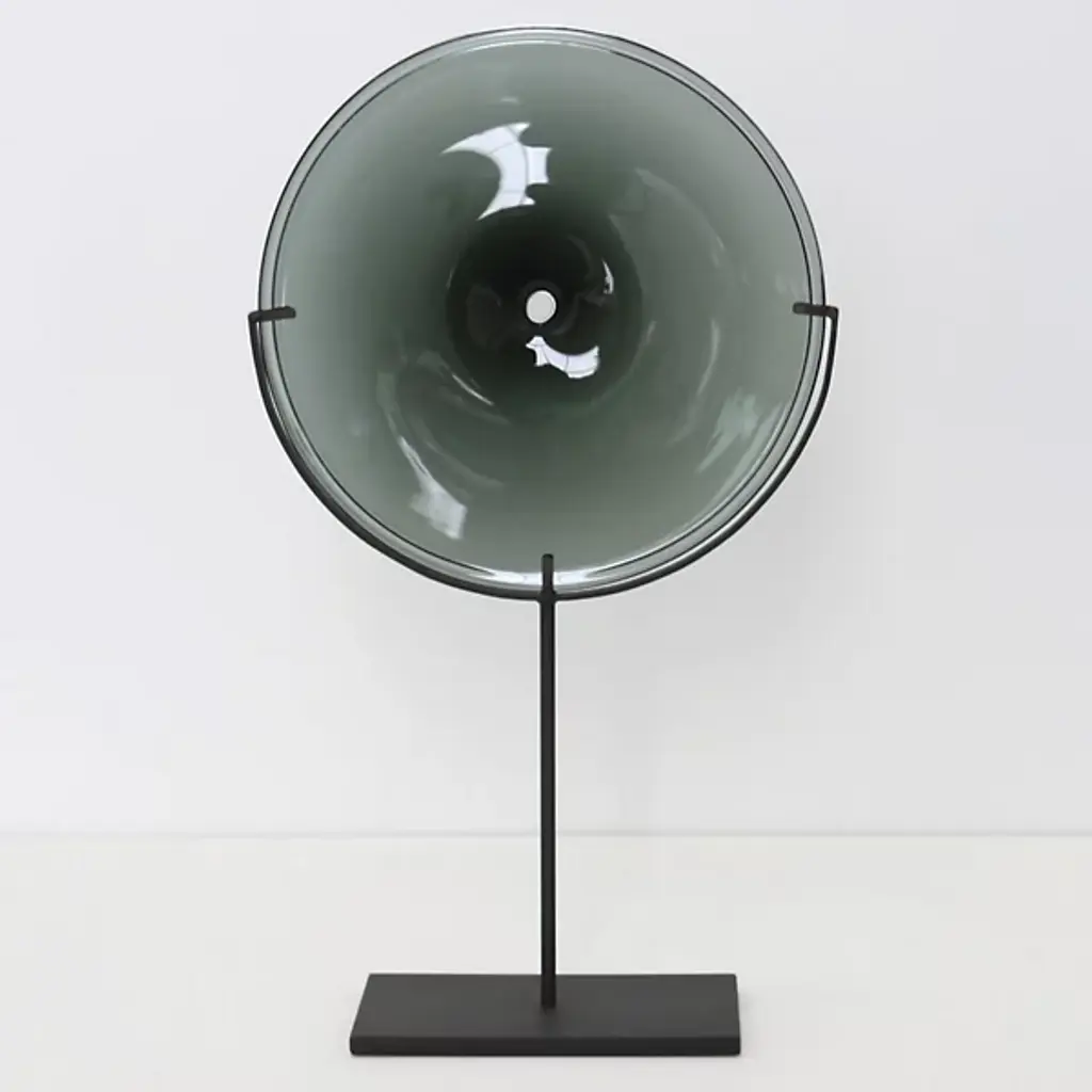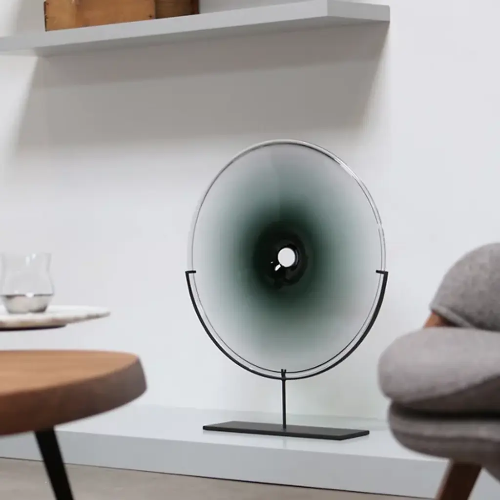 Hypnotizing like the soft ripples of a body of water. Handmade in the Czech Republic, the Pool Sculptural Object from SkLO reveals the beauty of the glassblowing process with a low-profile shape, flame polished to perfection. The object's clear visuals speak to SkLO's ethos of subtlety, restraint, and beauty. SkLO creates an ultra-sleek steel base and support to complement the subtle silhouette of the glass. Crafted into a slim disc, the hand-blown glass object reflects the touch of the artisan who created it as its center opening is a result of the blowing pipe being removed. Together with the flame-polished opening, the soft indentation of the glass pulls your eyes in as a mesmerizing image of reflections.