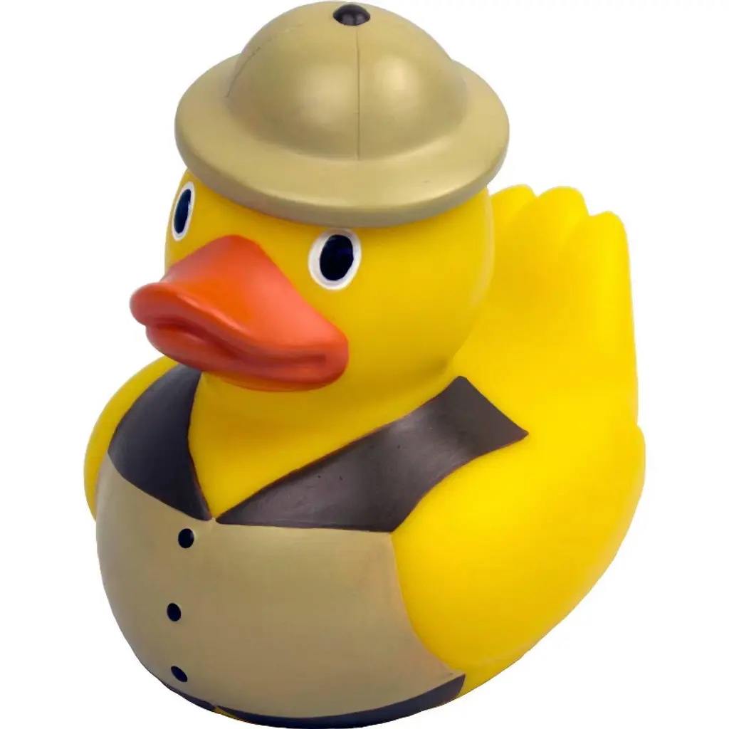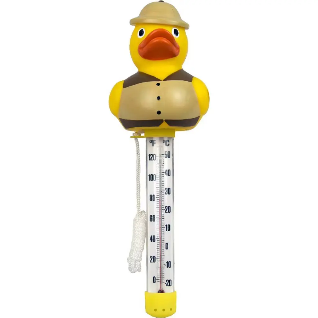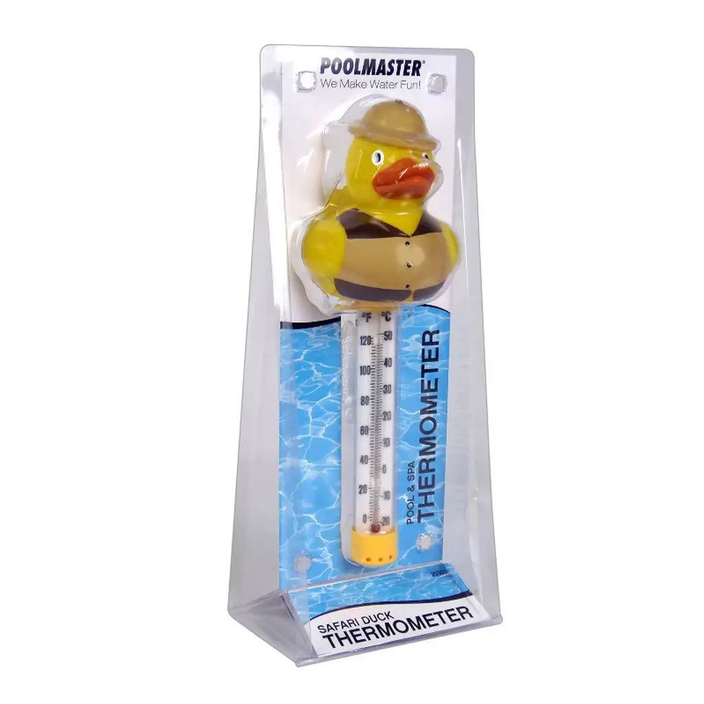 For measuring your water temperature, Poolmaster Safari Duck floating character pool thermometer adds fun and pizazz to your pool or spa. The soft molded material features design details, like vest with buttons and safari hat that bring the character to life! Safari Duck sits on top of a 1-inch diameter tube-style thermometer body that features an alcohol-based indicator with large, easy-to-read thermometer display all housed in a 360 degree shatterproof lens. The base of the thermometer is lightly weighted to ensure that Safari Duck is sitting upright in the water. A cord is included for tethering.