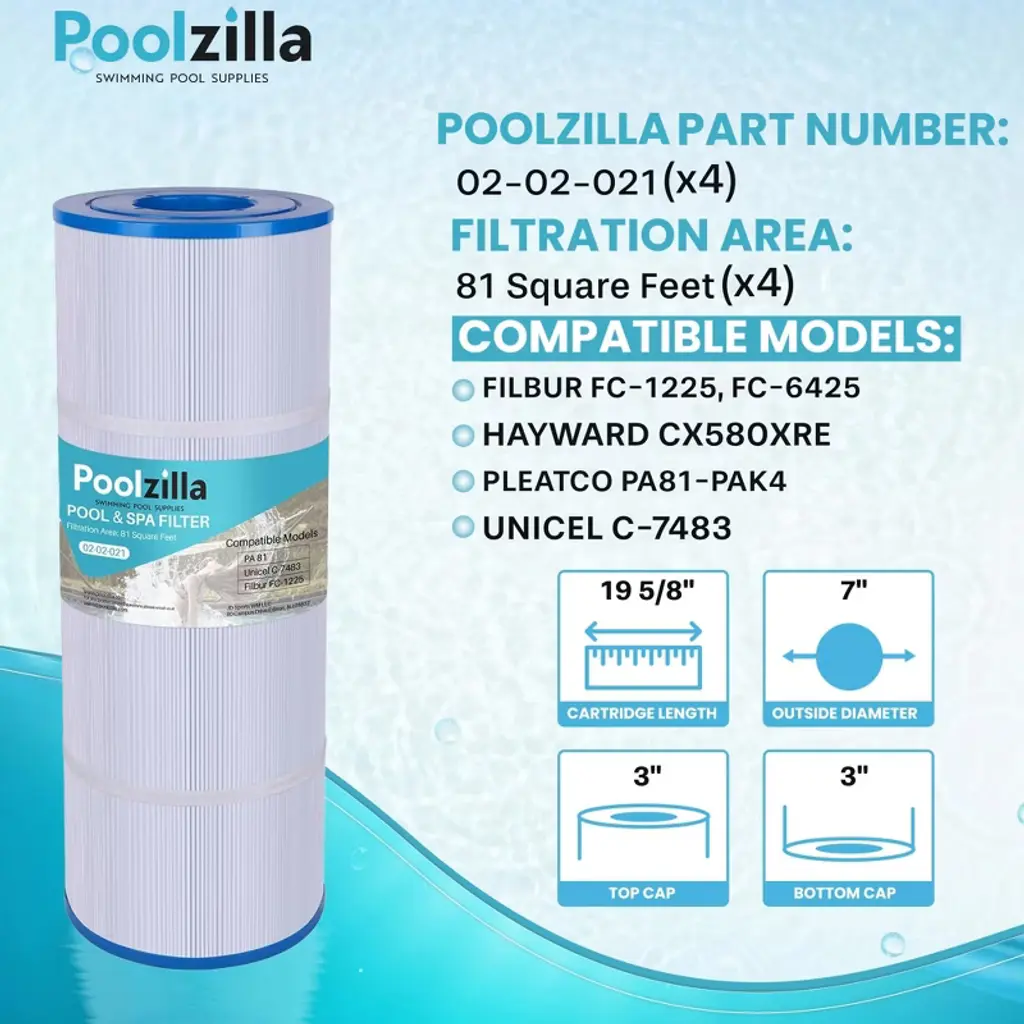 💧【Compatible Models】Length: 19 5/8'’; Outside Diameter: 7”; Top Opening: 3"; Bottom Opening: 3". Replacement CX580XRE Filter Cartridge for Hayward C580E, PA81-PAK4, Unicel C-7483, Hayward SwimClear C3020, C3025, C3030, Filbur FC-1225, FC-6425. NOTE: This is a compatible spare part and the manufacturers' names and part numbers have been used for reference purposes only. Poolzilla is an independent brand.💧【Premier Performance】Our filters are engineered with “Dirt-Trap” technology that enables the filter to trap more contaminants than traditional round fabric. This results in a cleaner filtration system and a healthier swimming environment. Our filters effectively trap leaves, bugs, sediment, hair, and more.💧【Long Lifespan】Premium pleated fabric is durable in the harshest conditions. Even with significant contaminant buildup, our filters are designed to maintain maximum flow rates throughout the season. Cleaning the filter is easily done by removing and washing with water. Filter service life is around 1-2 years with proper maintenance.💧【Purified】Poolzilla filter cartridges offer enhanced water clarity by efficiently removing a variety of contaminants. Visible particles such as sediment, turbidity, sand, silt, and rust will easily be filtered out. Additionally, chlorine taste and odor can significantly decrease with continued use of our cartridges.💧【Quality Customer Service】Poolzilla cares deeply about the integrity of our products. We promise a risk-free shopping experience fully backed by our Quality Control, Customer Service and Technical Support Teams, located in New Jersey.